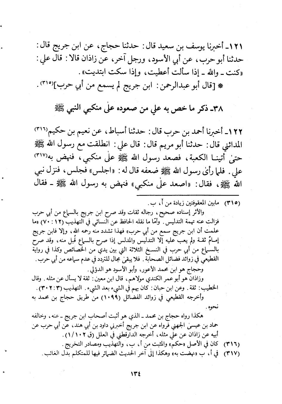 122 - أخبرنَا أَحْمد بن حَرْب قَالَ حَدثنَا أَسْبَاط عَن نعيم بن حَكِيم الْمَدَائِنِي قَالَ حَدثنَا أَبُو مَرْيَم قَالَ قَالَ عَليّ انْطَلَقت مَعَ رَسُول الله صلى الله عَلَيْهِ وَسلم حَتَّى أَتَيْنَا الْكَعْبَة فَصَعدَ رَسُول الله صلى الله عَلَيْهِ وَسلم على مَنْكِبي فَنَهَضَ بِهِ عَليّ فَلَمَّا رأى رَسُول الله صلى الله عَلَيْهِ وَسلم ضعفه قَالَ لَهُ اجْلِسْ فَجَلَسَ فَنزل نَبِي الله صلى الله عَلَيْهِ وَسلم فَقَالَ اصْعَدْ على مَنْكِبي فَنَهَضَ بِهِ رَسُول الله صلى الله عَلَيْهِ وَسلم فَقَالَ