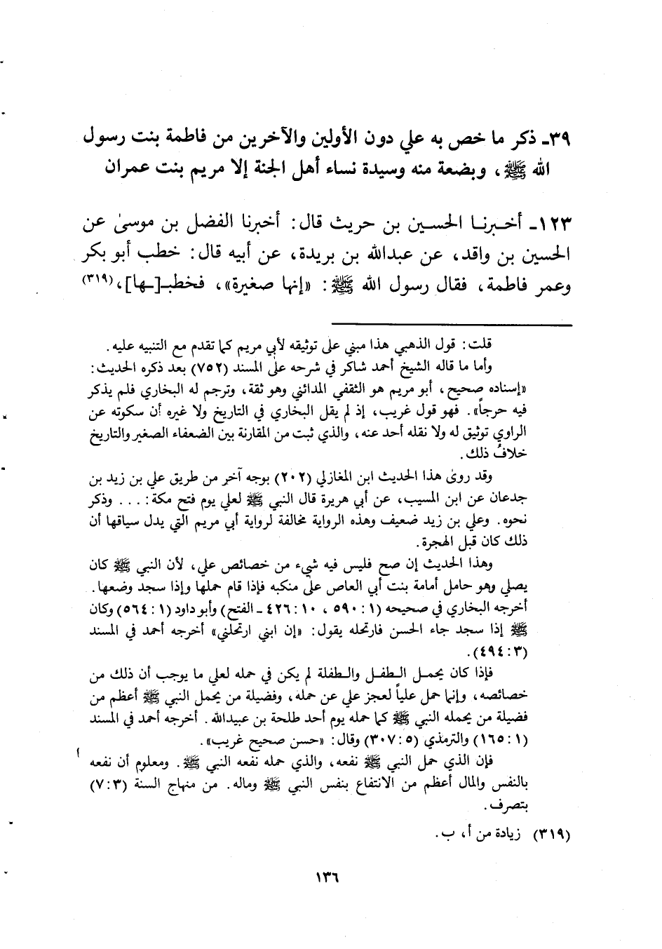 39 - ذكر مَا خص بِهِ عَليّ دون الْأَوَّلين والآخرين من فَاطِمَة بنت رَسُول الله صلى الله عَلَيْهِ وَسلم وَبضْعَة مِنْهُ وسيدة نسَاء أهل الْجنَّة إِلَّا مَرْيَم بنت عمرَان