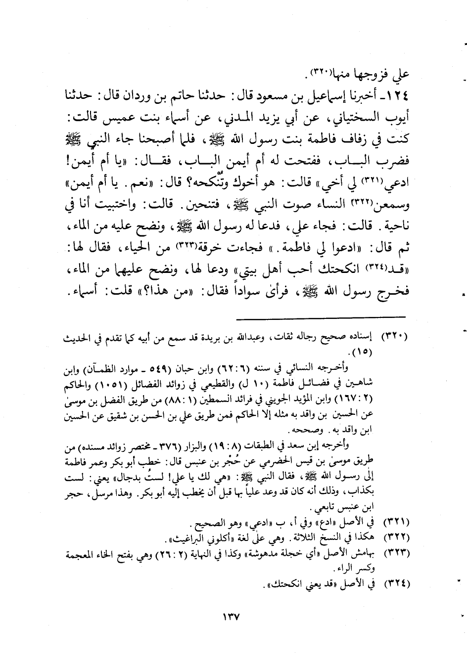 124 - أخبرنَا إِسْمَاعِيل بن مَسْعُود قَالَ حَدثنَا حَاتِم بن وردان قَالَ حَدثنَا أَيُّوب السّخْتِيَانِيّ عَن أبي يزِيد الْمدنِي عَن أَسمَاء بنت عُمَيْس قَالَت كنت فِي زفاف فَاطِمَة بنت رَسُول الله صلى الله عَلَيْهِ وَسلم فَلَمَّا أَصْبَحْنَا جَاءَ النَّبِي صلى الله عَلَيْهِ وَسلم فَضرب الْبَاب ففتحت لَهُ أم أَيمن الْبَاب فَقَالَ يَا أم أَيمن ادعِي لي أخي قَالَت هُوَ أَخُوك وتنكحه قَالَ نعم يَا أم أَيمن وسمعن النِّسَاء صَوت النَّبِي صلى الله عَلَيْهِ وَسلم فتنحين قَالَت وأختبيت أَنا فِي نَاحيَة قَالَت فجَاء عَليّ فَدَعَا لَهُ رَسُول الله صلى الله عَلَيْهِ وَسلم ونضح عَلَيْهِ من المَاء ثمَّ قَالَ ادعوا لي فَاطِمَة فَجَاءَت خرقَة من الْحيَاء فَقَالَ لَهَا قد أنكحتك أحب أهل بَيْتِي ودعا لَهَا ونضح عَلَيْهِمَا من المَاء فَخرج رَسُول الله صلى الله عَلَيْهِ وَسلم فَرَأى سوادا فَقَالَ من هَذَا قلت أَسمَاء