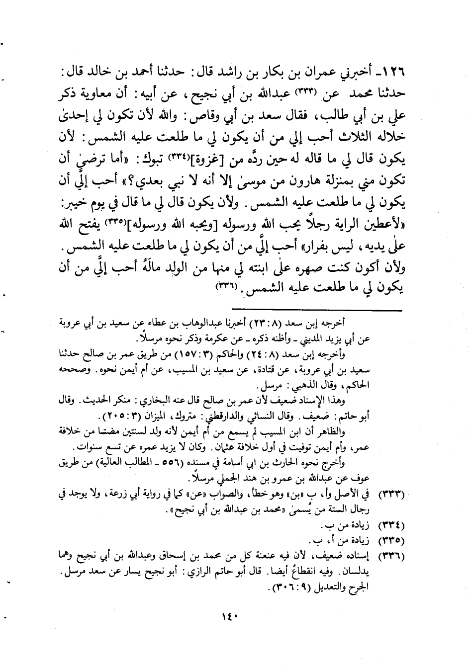 126 - أخبرنَا عمرَان بن بكار بن رَاشد قَالَ حَدثنَا أَحْمد بن خَالِد قَالَ حَدثنَا مُحَمَّد عَن عبد الله بن أبي نجيح عَن أَبِيه أَن مُعَاوِيَة ذكر عَليّ بن أبي طَالب فَقَالَ سعد بن أبي وَقاص وَالله لِأَن تكون لي إِحْدَى خلاله الثَّلَاث أحب إِلَيّ من أَن يكون لي مَا طلعت عَلَيْهِ الشَّمْس لِأَن يكون قَالَ لي مَا قَالَه لَهُ حِين رده من غَزْوَة تَبُوك أما ترْضى أَن تكون مني بِمَنْزِلَة هَارُون من مُوسَى إِلَّا أَنه لَا نَبِي بعدِي أحب إِلَيّ أَن يكون لي مَا طلعت عَلَيْهِ الشَّمْس وَلِأَن يكون قَالَ لي مَا قَالَ فِي يَوْم خَيْبَر لَأُعْطيَن الرَّايَة رجلا يحب الله وَرَسُوله وَيُحِبهُ الله وَرَسُوله يفتح الله على يَدَيْهِ لَيْسَ بفرار أحب إِلَيّ من أَن يكون لي مَا طلعت عَلَيْهِ الشَّمْس وَلِأَن أكون كنت صهره على ابْنَته لي مِنْهَا من الْوَلَد مَاله أحب إِلَيّ من أَن يكون لي مَا طلعت عَلَيْهِ الشَّمْس