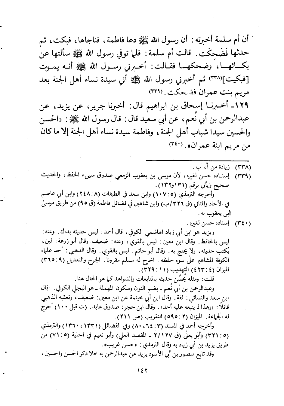 129 - أخبرنَا إِسْحَاق بن إِبْرَاهِيم قَالَ أخبرنَا جرير عَن يزِيد عَن عبد الرَّحْمَن بن أبي نعم عَن أبي سعيد قَالَ قَالَ رَسُول الله صلى الله عَلَيْهِ وَسلم الْحسن وَالْحُسَيْن سيدا شباب أهل الْجنَّة وَفَاطِمَة سيدة نسَاء أهل الْجنَّة إِلَّا مَا كَانَ من مَرْيَم بنت عمرَان