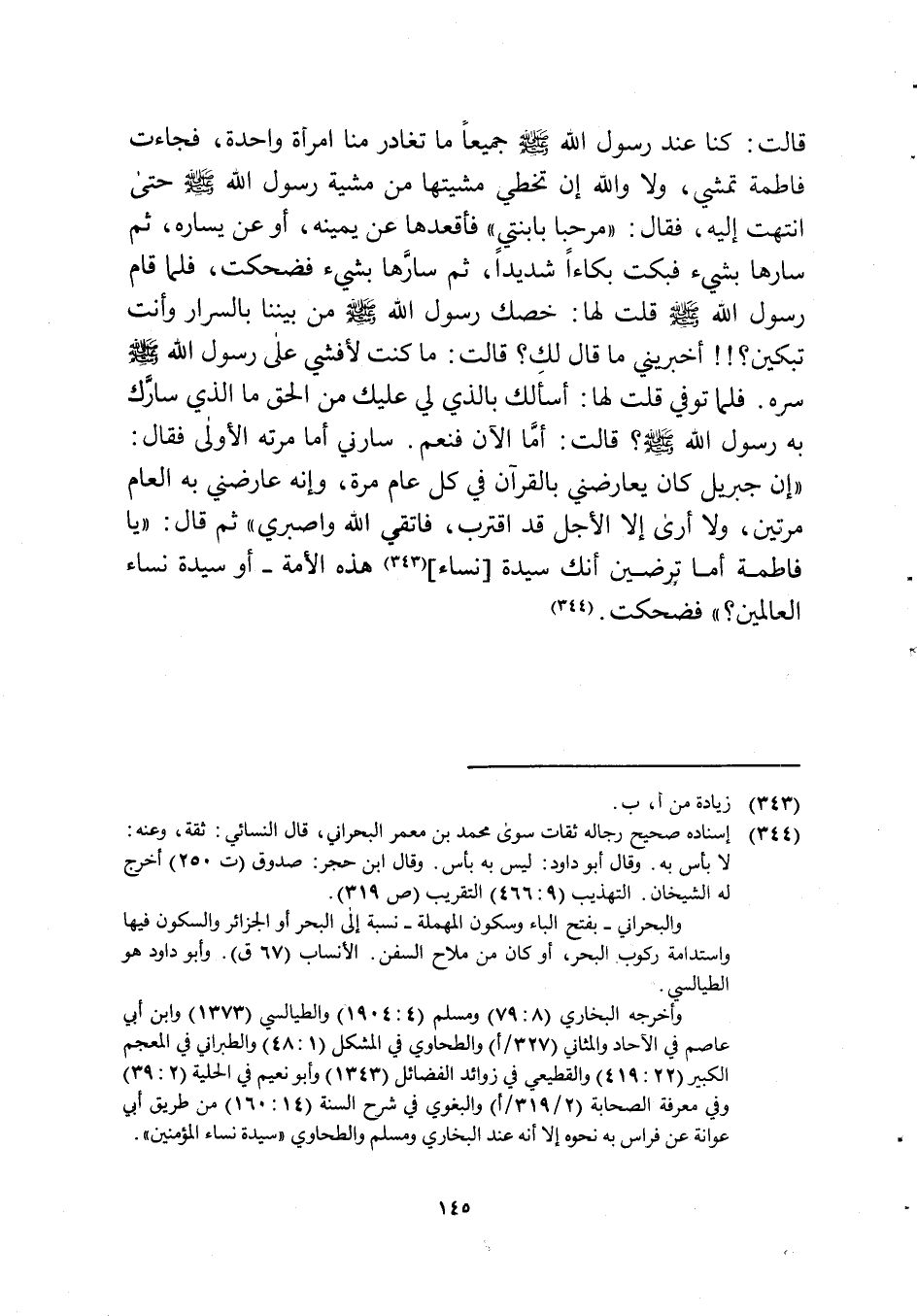 قَالَت كُنَّا عِنْد رَسُول الله صلى الله عَلَيْهِ وَسلم جَمِيعًا مَا تغادر منا امْرَأَة وَاحِدَة فَجَاءَت فَاطِمَة تمشي وَلَا وَالله إِن تخطي مشيتهَا من مشْيَة رَسُول الله صلى الله عَلَيْهِ وَسلم حَتَّى انْتَهَت إِلَيْهِ فَقَالَ مرْحَبًا بِابْنَتي فأقعدها عَن يَمِينه أَو عَن يسَاره ثمَّ سَارهَا بِشَيْء فَبَكَتْ بكاءا شَدِيدا ثمَّ سَارهَا بِشَيْء فَضَحكت فَلَمَّا قَامَ رَسُول الله صلى الله عَلَيْهِ وَسلم قلت لَهَا خصك رَسُول الله صلى الله عَلَيْهِ وَسلم من بَيْننَا بالسرار وَأَنت تبكين أَخْبِرِينِي مَا قَالَ لَك قَالَت مَا كنت لأفشي على رَسُول الله صلى الله عَلَيْهِ وَسلم سره فَلَمَّا توفّي قلت لَهَا أَسأَلك بِالَّذِي لي عَلَيْك من الْحق مَا الَّذِي سارك بِهِ رَسُول الله صلى الله عَلَيْهِ وَسلم قَالَت أما الْآن فَنعم سَارَّنِي أما مرته الأولى فَقَالَ إِن جِبْرِيل كَانَ يعارضني بِالْقُرْآنِ فِي كل عَام مرّة وَإنَّهُ عارضني بِهِ الْعَام مرَّتَيْنِ وَلَا أرى إِلَّا الْأَجَل قد أقترب فأتقي الله واصبري ثمَّ قَالَ يَا فَاطِمَة أما ترْضينَ أَنَّك سيدة نسَاء هَذِه الْأمة أَو سيدة نسَاء الْعَالمين فَضَحكت