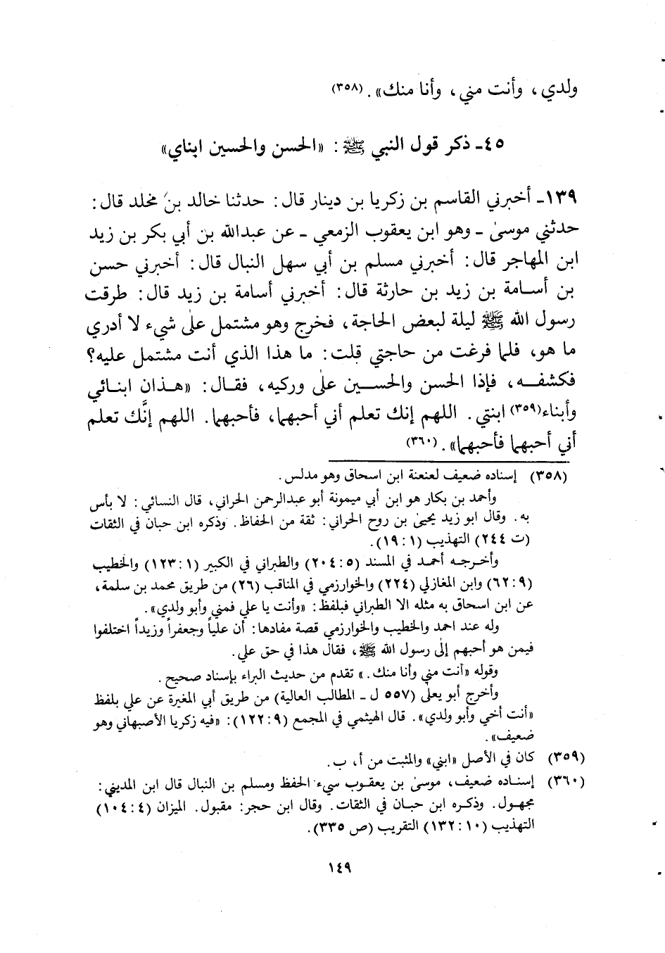 139 - أَخْبرنِي الْقَاسِم بن زَكَرِيَّا بن دِينَار قَالَ حَدثنَا خَالِد بن مخلد قَالَ حَدثنِي مُوسَى وَهُوَ ابْن يَعْقُوب الزمعِي عَن عبد الله بن أبي بكر بن زيد بن المُهَاجر قَالَ أَخْبرنِي مُسلم بن أبي سهل النبال قَالَ أَخْبرنِي حسن بن أُسَامَة بن زيد بن حَارِثَة قَالَ أَخْبرنِي أُسَامَة بن زيد قَالَ طرقت رَسُول الله صلى الله عَلَيْهِ وَسلم لَيْلَة لبَعض الْحَاجة فَخرج وَهُوَ مُشْتَمل على شَيْء لَا أَدْرِي مَا هُوَ فَلَمَّا فرغت من حَاجَتي قلت مَا هَذَا الَّذِي أَنْت مُشْتَمل عَلَيْهِ فكشفه فَإِذا الْحسن وَالْحُسَيْن على وركيه فَقَالَ هَذَانِ أبنائي وَأَبْنَاء ابْنَتي اللَّهُمَّ إِنَّك تعلم أَنِّي أحبهما فأحبهما اللَّهُمَّ إِنَّك تعلم أَنِّي أحبهما فأحبهما