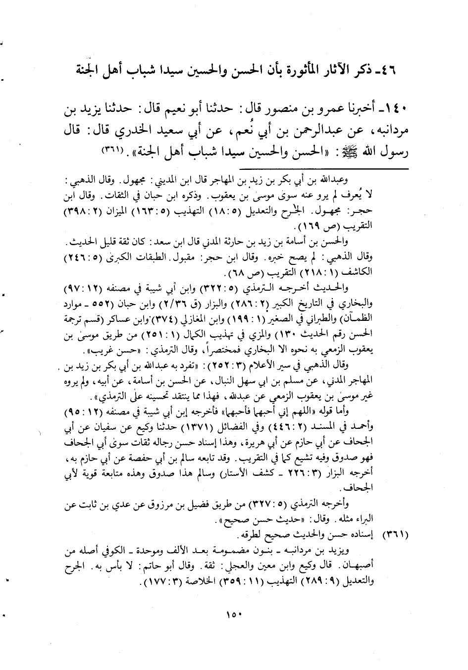 46 - ذكر الْآثَار المأثورة بِأَن الْحسن وَالْحُسَيْن سيدا شباب أهل الْجنَّة