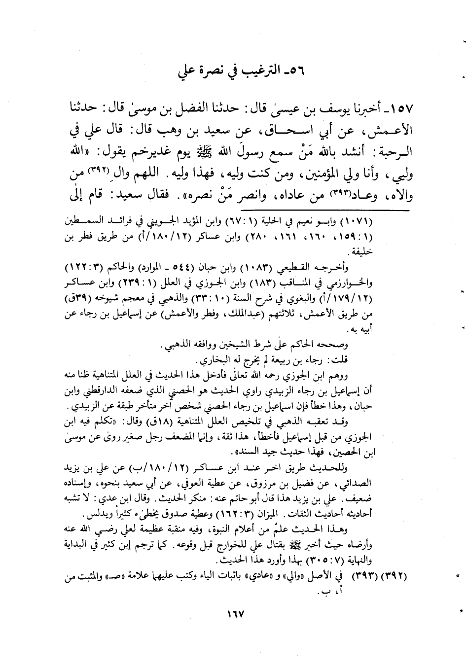 157 - أخبرنَا يُوسُف بن عِيسَى قَالَ حَدثنَا الْفضل بن مُوسَى قَالَ حَدثنَا الْأَعْمَش عَن أبي إِسْحَاق عَن سعيد بن وهب قَالَ قَالَ عَليّ فِي الرحبة أنْشد بِاللَّه من سمع رَسُول الله صلى الله عَلَيْهِ وَسلم يَوْم غَدِير خم يَقُول الله وليي وَأَنا ولي الْمُؤمنِينَ وَمن كنت وليه فَهَذَا وليه اللَّهُمَّ وَال من وَالَاهُ وَعَاد من عَادَاهُ وأنصر من نَصره فَقَالَ سعيد قَامَ إِلَى