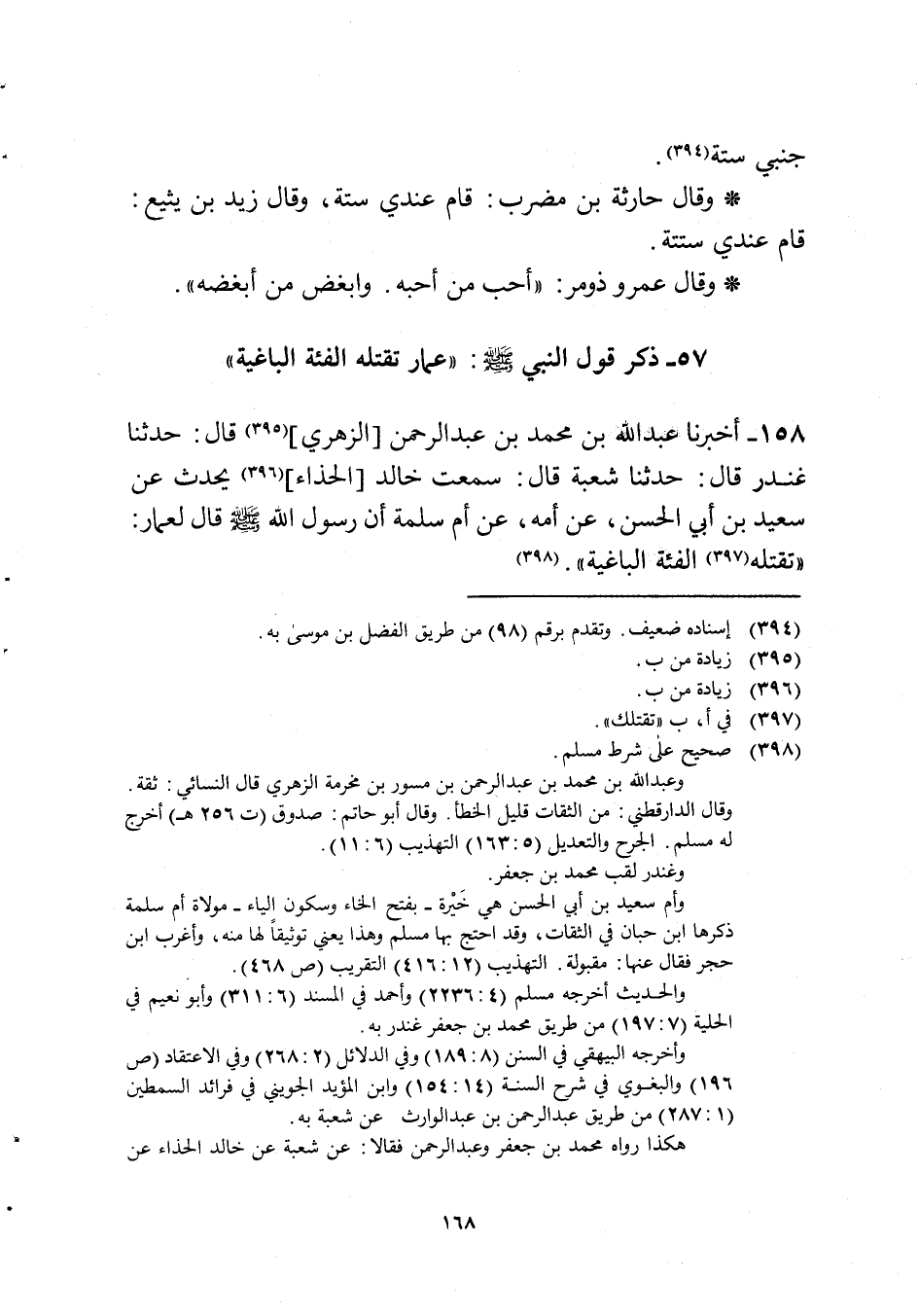 158 - أخبرنَا عبد الله بن مُحَمَّد بن عبد الرَّحْمَن الزُّهْرِيّ قَالَ حَدثنَا غنْدر قَالَ حَدثنَا شُعْبَة قَالَ سَمِعت خَالِد الْحذاء يحدث عَن سعيد بن أبي الْحسن عَن أمه عَن أم سَلمَة أَن رَسُول الله صلى الله عَلَيْهِ وَسلم قَالَ لعمَّار تقتله الفئة الباغية