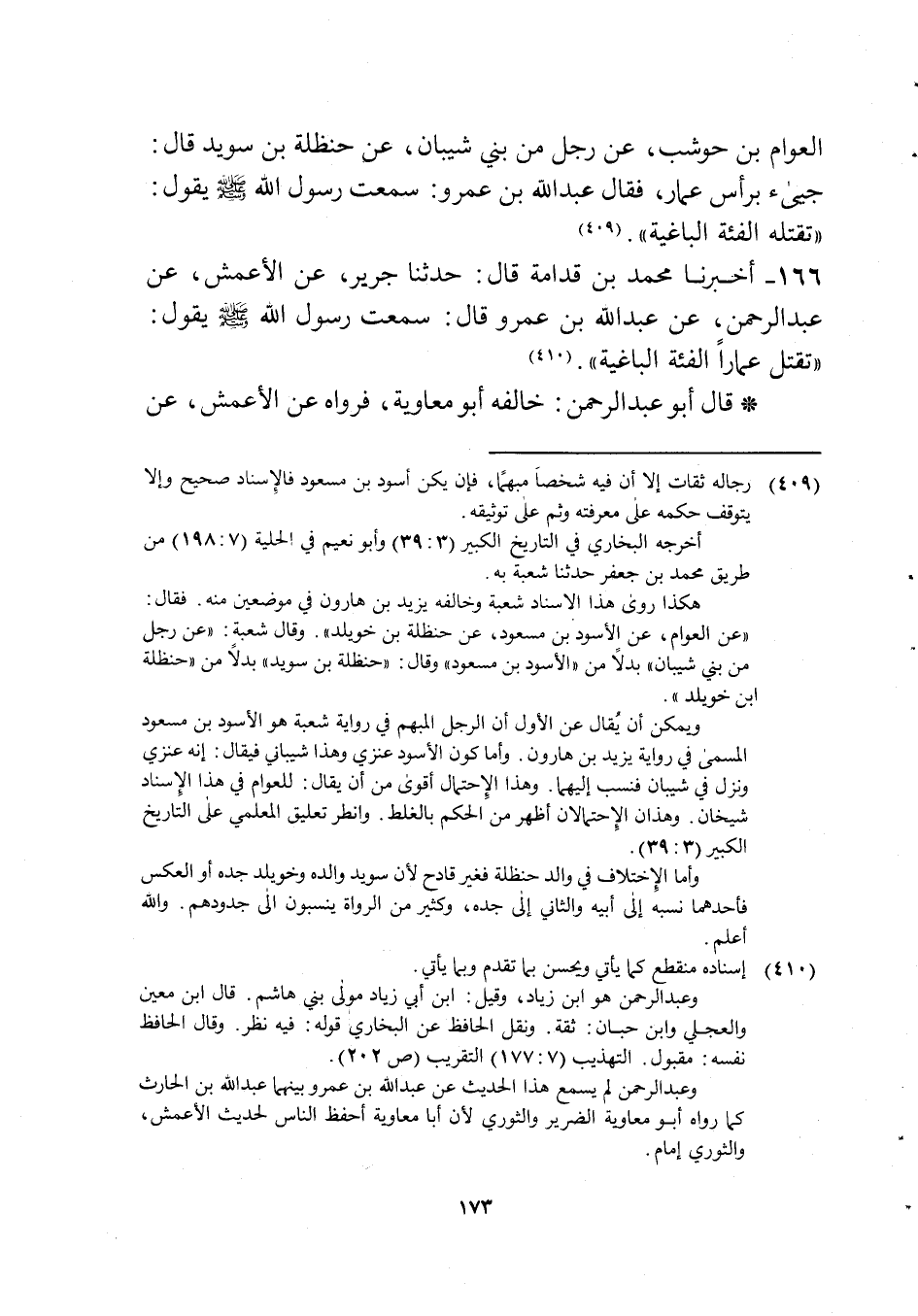 166 - أخبرنَا مُحَمَّد بن قدامَة قَالَ حَدثنَا جرير عَن الْأَعْمَش عَن عبد الرَّحْمَن عَن عبد الله بن عَمْرو قَالَ سَمِعت رَسُول الله صلى الله عَلَيْهِ وَسلم يَقُول تقتل عمارا الفئة الباغية