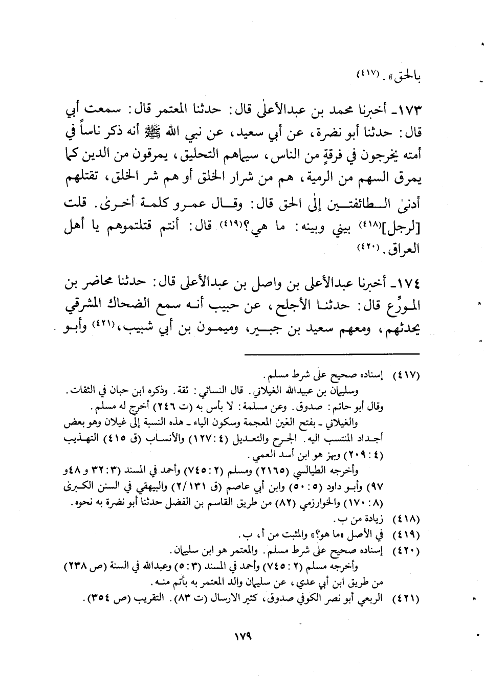 173 - أخبرنَا مُحَمَّد بن عبد الْأَعْلَى قَالَ حَدثنَا الْمُعْتَمِر قَالَ سَمِعت أبي قَالَ حَدثنَا أَبُو نَضرة عَن أبي سعيد عَن نَبِي الله صلى الله عَلَيْهِ وَسلم أَنه ذكر نَاسا فِي أمته يخرجُون فِي فرقة من النَّاس سِيمَاهُمْ التحليق يَمْرُقُونَ من الدّين كَمَا يَمْرُق السهْم من الرَّمية هم من شرار الْخلق أَو هم شَرّ الْخلق تقتلهم أدنى الطَّائِفَتَيْنِ إِلَى الْحق قَالَ وَقَالَ عَمْرو كلمة أُخْرَى قلت لرجل بيني وَبَينه مَا هِيَ قَالَ أَنْتُم قَتَلْتُمُوهُ يَا أهل الْعرَاق