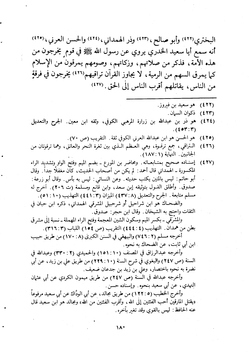البخْترِي وَأَبُو صَالح وذر الْهَمدَانِي وَالْحسن العرني انه سمع أَبَا سعيد الْخُدْرِيّ يروي عَن رَسُول الله صلى الله عَلَيْهِ وَسلم فِي قوم يخرجُون من هَذِه الْأمة فَذكر من صلَاتهم وزكاتهم وصومهم يَمْرُقُونَ من الْإِسْلَام كَمَا يَمْرُق السهْم من الرَّمية لَا يُجَاوز الْقُرْآن تراقيهم يخرجُون فِي فرقة من النَّاس يقاتلهم اقْربْ النَّاس إِلَى الْحق