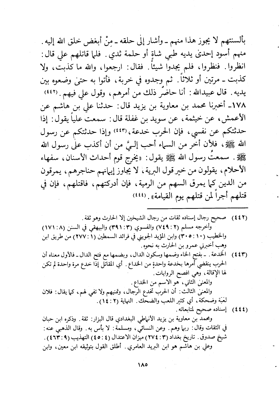 178 - أخبرنَا مُحَمَّد بن مُعَاوِيَة بن يزِيد قَالَ حَدثنَا عَليّ بن هَاشم عَن الْأَعْمَش عَن خَيْثَمَة عَن سُوَيْد بن غَفلَة قَالَ سَمِعت عليا يَقُول إِذا حدثتكم عَن نَفسِي فان الْحَرْب خدعة وَإِذا حدثتكم عَن رَسُول الله صلى الله عَلَيْهِ وَسلم يَقُول يخرج قوم أَحْدَاث الْأَسْنَان سُفَهَاء الأحلام يَقُولُونَ من خير قَول الْبَريَّة لَا يُجَاوز إِيمَانهم حَنَاجِرهمْ يَمْرُقُونَ من الدّين كمل يَمْرُق السهْم من الرَّمية فَإِن أدر كتهم فأقتلهم فَإِن فِي قَتلهمْ أجرا لمن يقتلهُمْ يَوْم الْقِيَامَة