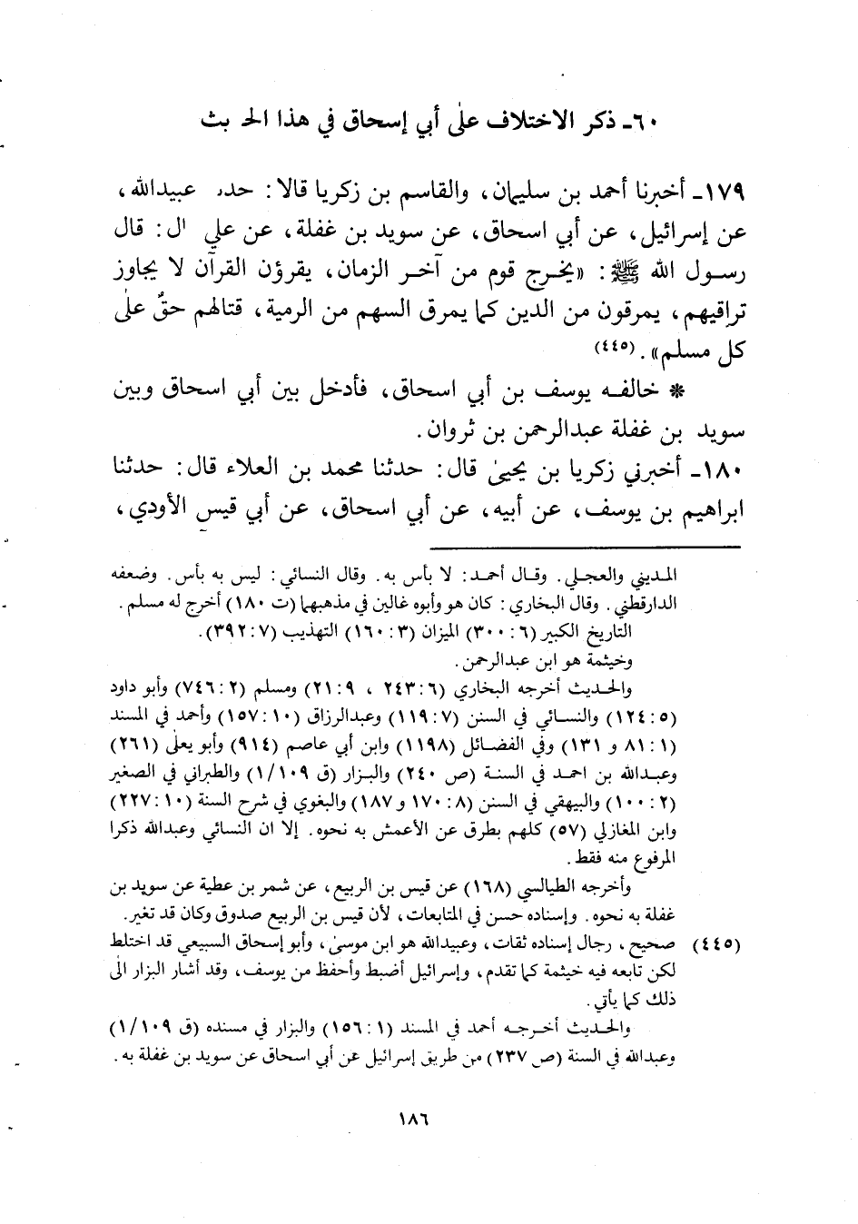 179 - أخبرنَا أَحْمد بن سُلَيْمَان وَالقَاسِم بن زَكَرِيَّا قَالَا حَدثنَا عبيد الله عَن إِسْرَائِيل عَن أبي إِسْحَاق عَن سُوَيْد بن غَفلَة عَن عَليّ قَالَ رَسُول الله صلى الله عَلَيْهِ وَسلم يخرج قوم من آخر الزَّمَان يقرؤن الْقُرْآن لَا يُجَاوز تراقيهم يَمْرُقُونَ من الدّين كَمَا يَمْرُق السهْم من الرَّمية قِتَالهمْ حق على كل مُسلم