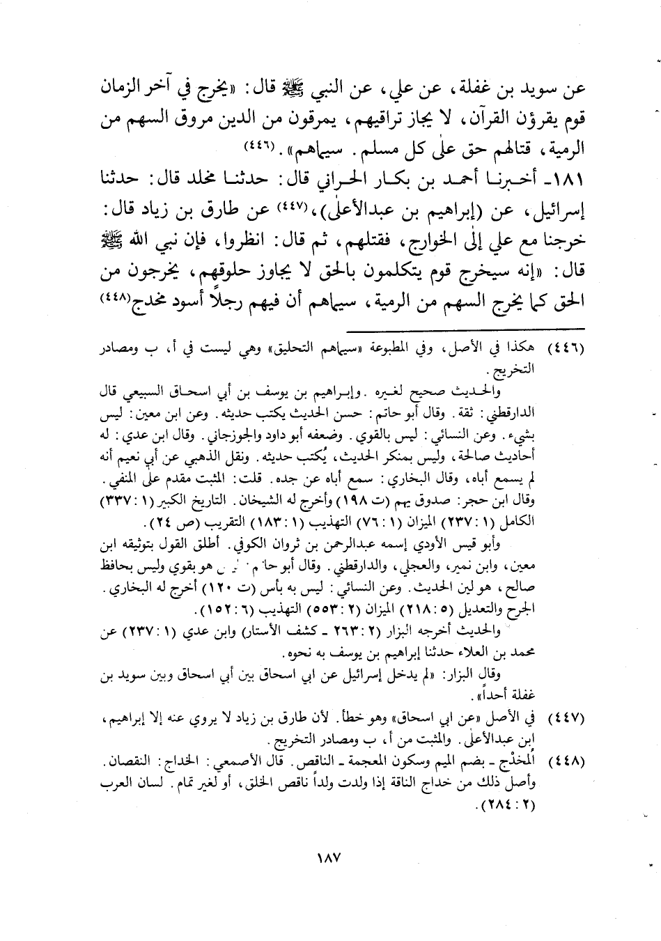 181 - أخبرنَا أَحْمد بن بكار الْحَرَّانِي قَالَ حَدثنَا مخلد قَالَ حَدثنَا إِسْرَائِيل عَن إِبْرَاهِيم بن عبد الْأَعْلَى عَن طَارق بن زِيَاد قَالَ خرجنَا مَعَ عَليّ إِلَى الْخَوَارِج فَقَتلهُمْ ثمَّ قَالَ انْظُرُوا فَإِن النَّبِي صلى الله عَلَيْهِ وَسلم قَالَ أَنه سيخرج قوم يَتَكَلَّمُونَ بِالْحَقِّ لَا يُجَاوز حُلُوقهمْ يخرجُون من الْحق كَمَا يخرج السهْم من الرَّمية سِيمَاهُمْ أَن فيهم رجلا أسود مُخْدج