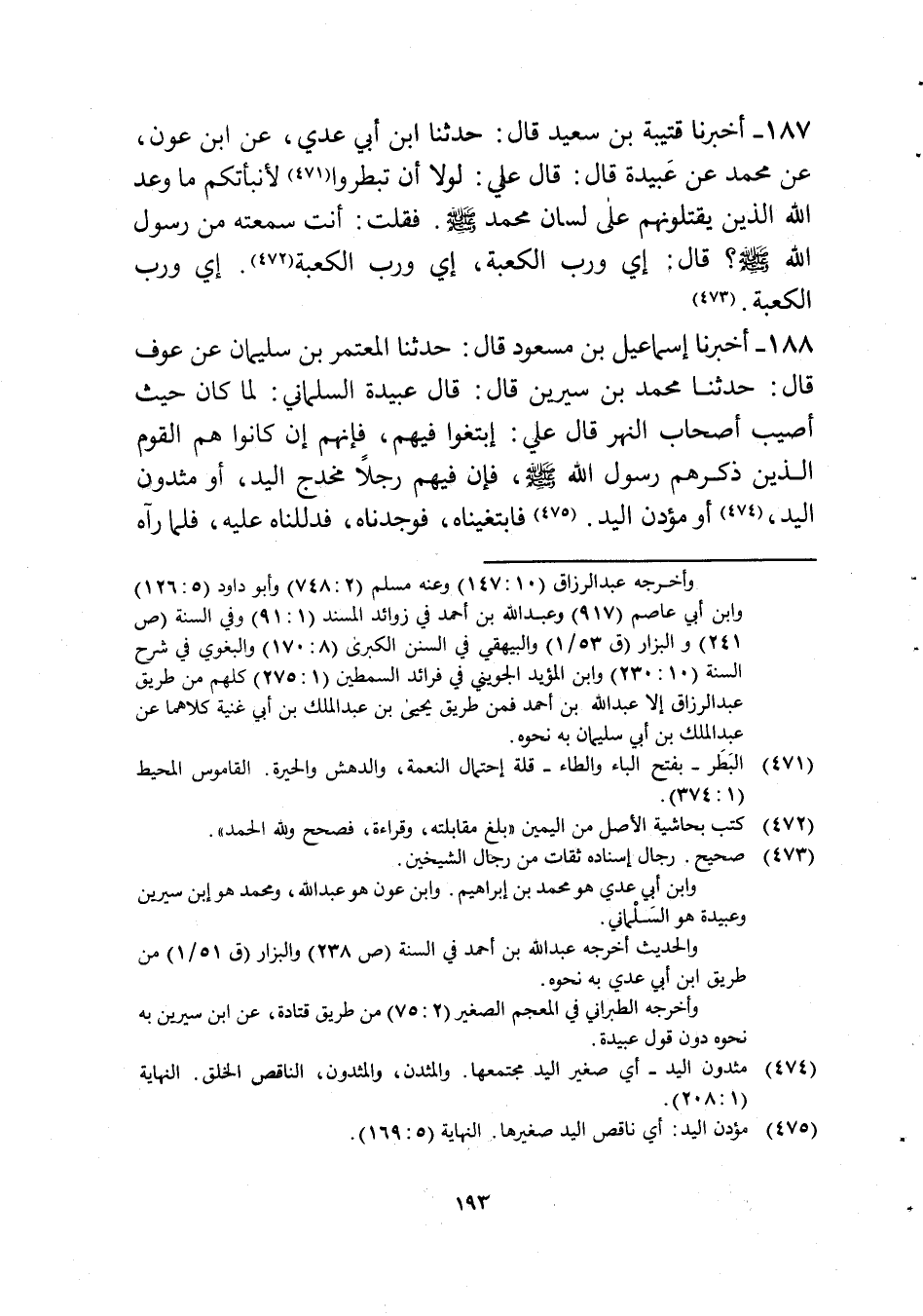 188 - أخبرنَا إِسْمَاعِيل بن مَسْعُود قَالَ حَدثنَا الْمُعْتَمِر بن سُلَيْمَان عَن عَوْف قَالَ حَدثنَا مُحَمَّد بن سِيرِين قَالَ قَالَ عُبَيْدَة السَّلمَانِي لما كَانَ حَيْثُ أُصِيب أَصْحَاب النَّهر قَالَ عَليّ ابْتَغوا فيهم فَإِنَّهُم إِن كَانُوا هم الْقَوْم الَّذين ذكرهم رَسُول الله صلى الله عَلَيْهِ وَسلم فَإِن فيهم رجلا مُخْدج الْيَد أَو مثدون الْيَد أَو موذن الْيَد فابتغيناه فوجدناه فدللناه عَلَيْهِ فَلَمَّا رَآهُ