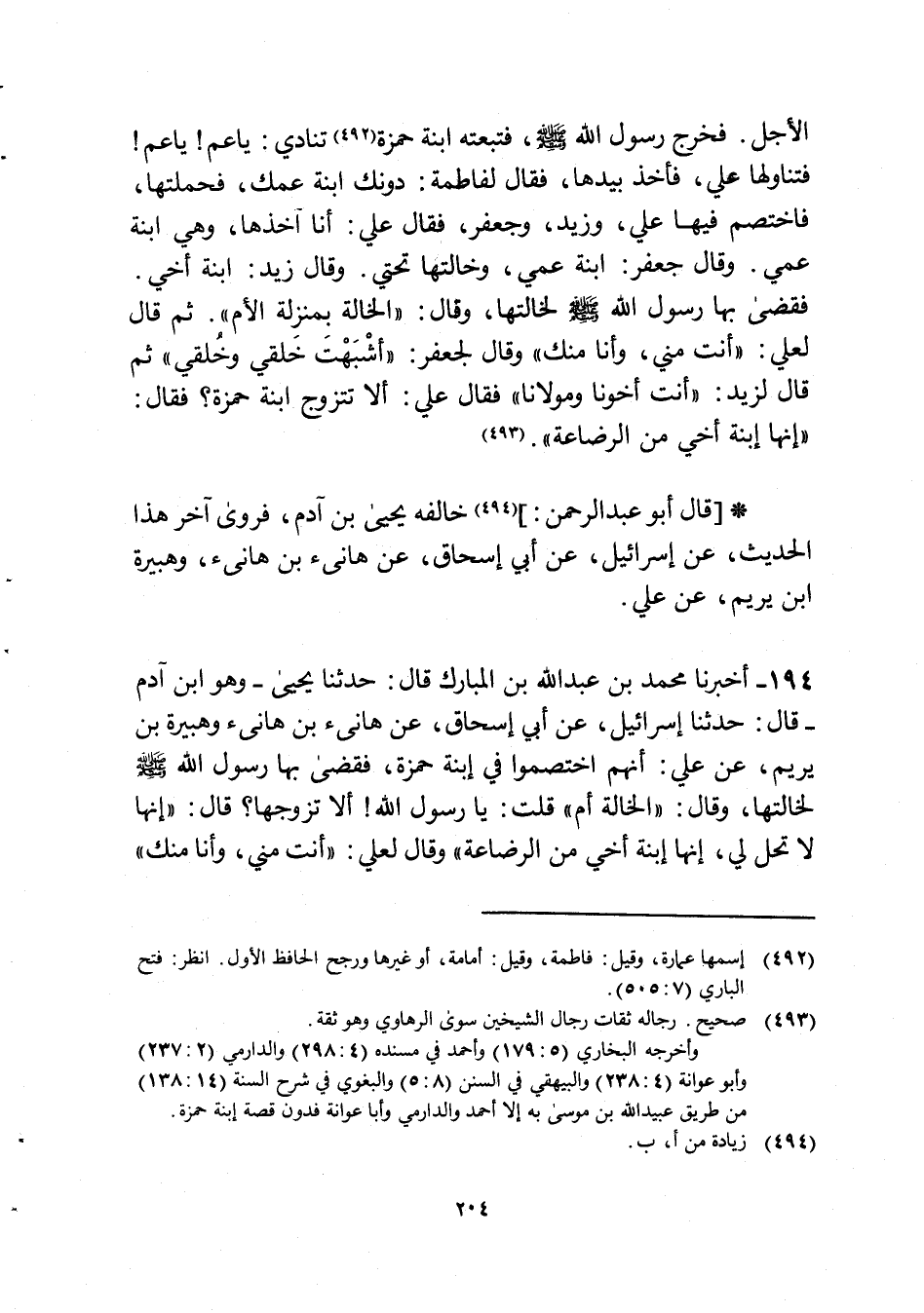 194 - أخبرنَا مُحَمَّد بن عبد الله بن الْمُبَارك قَالَ حَدثنَا يحيى وَهُوَ ابْن آدم قَالَ حَدثنَا إِسْرَائِيل عَن أبي إِسْحَاق عَن هانىء بن هانىء وهبيرة بن يريم عَن عَليّ انهم اخْتَصَمُوا فِي ابْنة حَمْزَة فَقضى بهَا رَسُول الله صلى الله عَلَيْهِ وَسلم لخالتها وَقَالَ الْخَالَة أم قلت يَا رَسُول الله أَلا تزَوجهَا قَالَ إِنَّهَا لَا تحل لي إِنَّهَا ابْنة أخي من الرضَاعَة وَقَالَ لعَلي أَنْت مني وَأَنا مِنْك