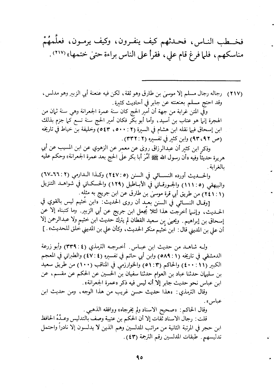 فَخَطب النَّاس فَحَدثهُمْ كَيفَ ينفرون وَكَيف يرْمونَ فعلمهم مناسكهم فَلَمَّا فرغ قَامَ عَليّ فَقَرَأَ على النَّاس بَرَاءَة حَتَّى خَتمهَا