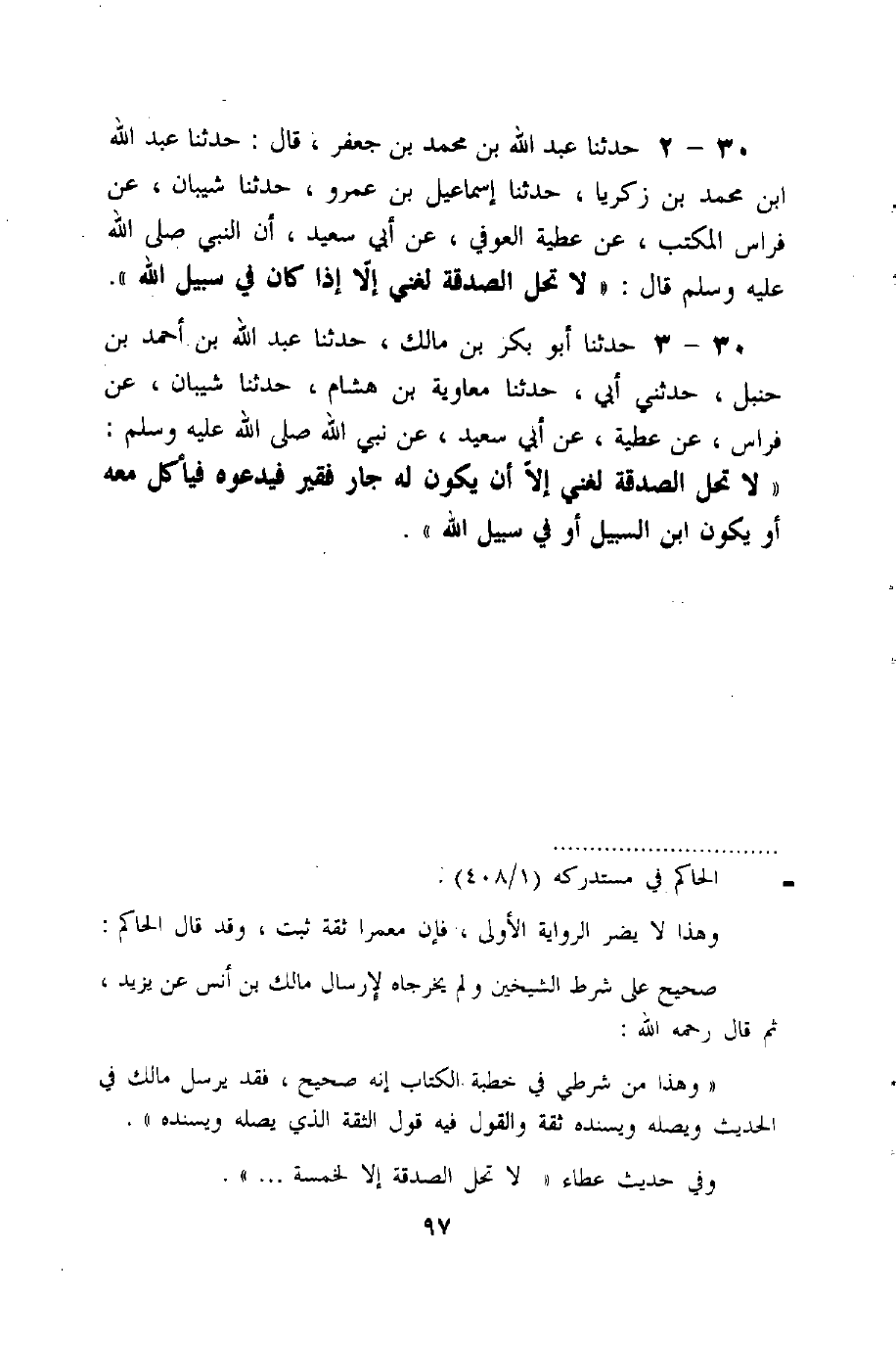 30 - حَدَّثَنَا عَبْدُ اللهِ بْنُ مُحَمَّدِ بْنِ جَعْفَرٍ قَالَ: حَدَّثَنَا عَبْدُ اللهِ بْنُ مُحَمَّدِ بْنِ زَكَرِيَّا، حَدَّثَنَا إِسْمَاعِيلُ بْنُ عَمْرٍو، حَدَّثَنَا شَيْبَانُ، عَنْ فِرَاسٍ الْمُكْتِبِ، عَنْ عَطِيَّةَ الْعَوْفِيِّ، عَنْ أَبِي سَعِيدٍ أَنَّ النَّبِيَّ صَلَّى اللَّهُ عَلَيْهِ وَسَلَّمَ قَالَ: «§لَا تَحِلُّ الصَّدَقَةُ لِغَنِيٍّ إِلَّا إِذَا كَانَ فِي سَبِيلِ اللهِ»