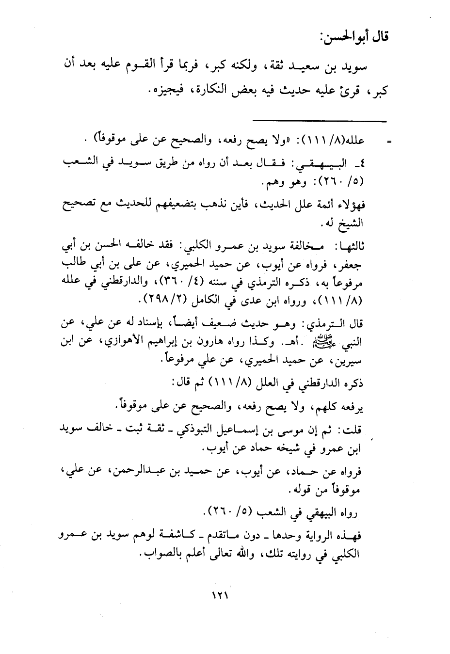 قَالَ أَبُو الْحَسَنِ: سُوَيْدُ بْنُ سَعِيٍد ثِقَةٌ، وَلَكِنَّهُ كَبِرَ، فَرُبَّمَا قَرَأَ الْقُومُ عَلَيهِ بَعْدَ أَنْ كَبِرَ، قُرِئَ عَلَيْهِ حَدِيثٌ فِيهِ بَعْضُ النَّكَارَةِ، فَيُجِيزُهُ،