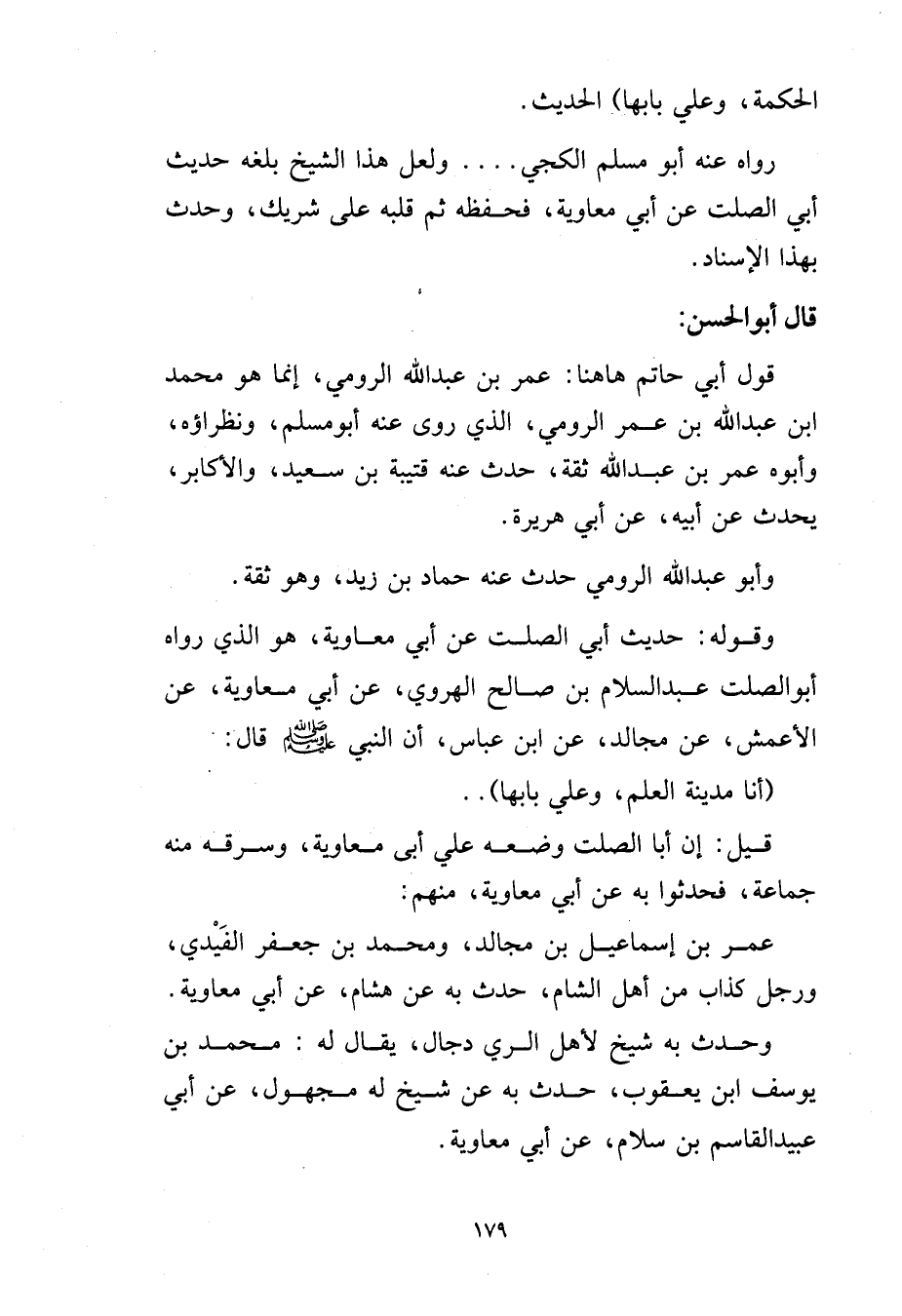 هُوَ الَّذِي رَوَاهُ أَبُو الصَّلْتِ عَبْدُ السَّلامِ بْنُ صَالِحٍ الْهَرَوِيُّ، عَنْ أَبِي مُعَاوِيَةَ، عَنِ الأَعْمَشِ، عَنْ مُجَالِدٍ، عَنِ ابْنِ عَبَّاسٍ، أَنّ النَّبِيَّ صَلَّى اللَّهُ عَلَيْهِ وَسَلَّمَ، قَالَ: «أَنَا مَدِينَةُ الْعِلْمِ، وَعَلِيٌّ بَابُهَا» .