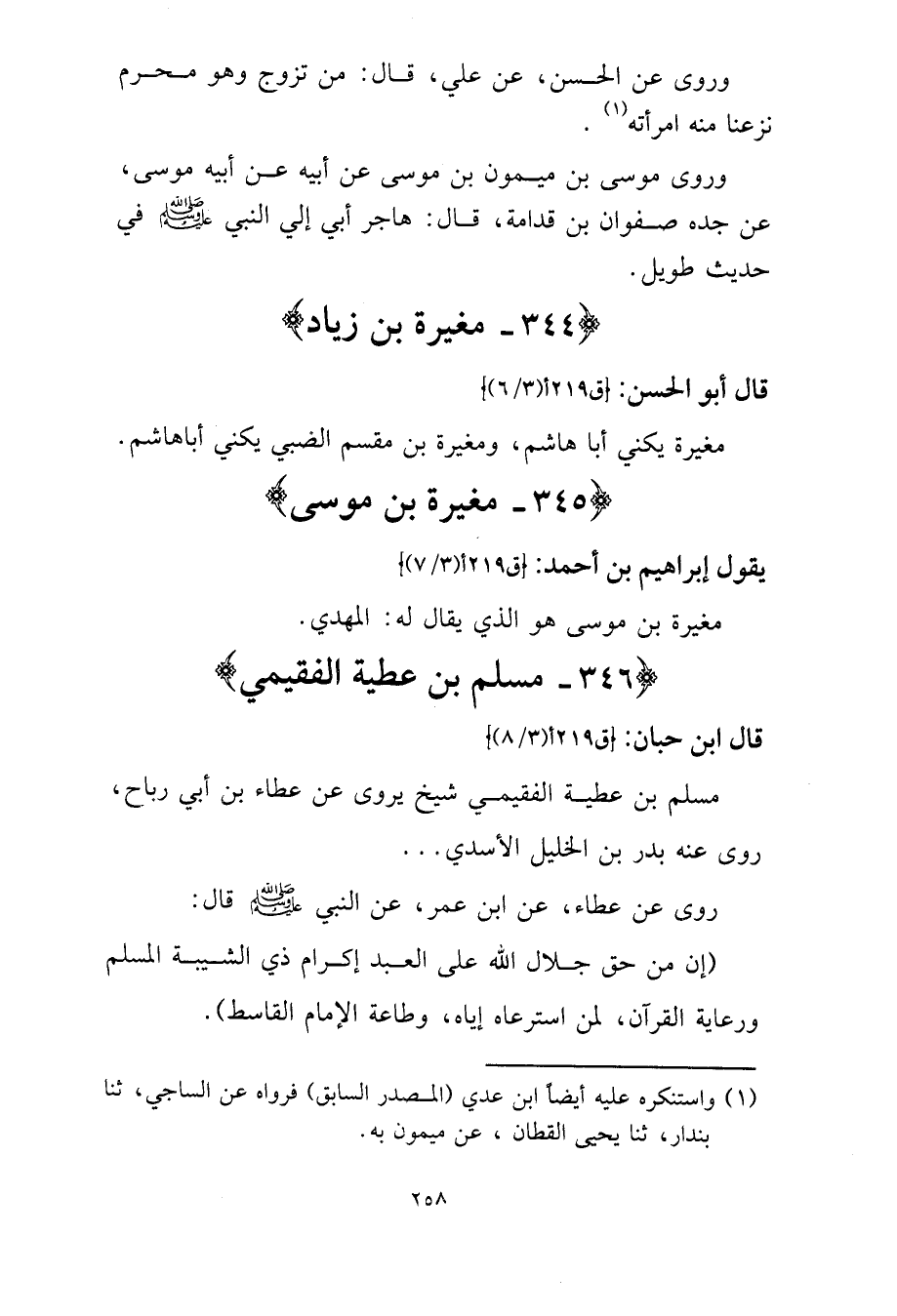 قَالَ ابْنُ حِبَّانَ: مُسْلِمُ بْنُ عَطِيَّةَ الْفُقَيْمِيُّ شَيْخٌ يَرْوِي عَنْ عَطَاءِ بْنِ أَبِي رَبَاحٍ، رَوَى عَنْهُ بَدْرُ بْنُ الْخَلِيلِ الأَسَدِيُّ، رَوَى عَنْ عَطَاءٍ، عَنِ ابْنِ عُمَرَ، عَن ِالنَّبِيِّ صَلَّى اللَّهُ عَلَيْهِ وَسَلَّمَ، قَالَ: «إِنَّ مِنْ حَقِّ جَلالِ اللَّهِ عَلَى الْعَبْدِ إِكْرَامَ ذِي الشَّيْبَةِ الْمُسْلِمِ، وَرِعَايَةَ الْقُرْآنِ لِمَنِ اسْتَرْعَاهُ إِيَّاهُ، وَطَاعَةَ الإِمَامِ الْقَاسِطِ»