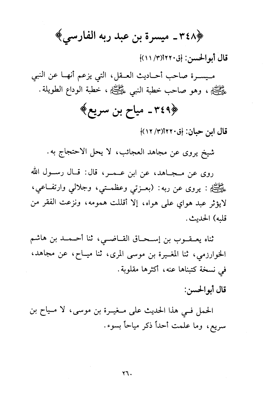 قَالَ أَبُو الْحَسَنِ: ميسرَة صَاحب أَحَادِيث الْعقل، الَّتِي يزْعم أَنَّهَا عَن النَّبِي صَلَّى اللَّهُ عَلَيْهِ وَسَلَّمَ، وَهُوَ صَاحب خطْبَة النَّبِي صَلَّى اللَّهُ عَلَيْهِ وَسَلَّمَ، خطْبَة الْوَدَاع الطَّوِيلَة.