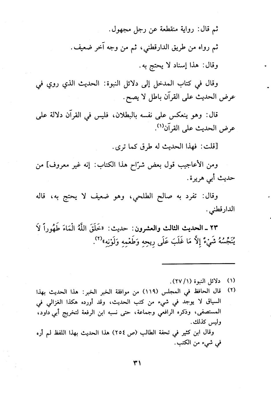 23 - الحَدِيث الثَّالِث وَالْعشْرُونَ: حَدِيث: «خلق الله المَاء طهُورا لَا يُنجسهُ شَيْء إِلَّا مَا غلب عَلَى رِيحه وطعمه ولونه» .