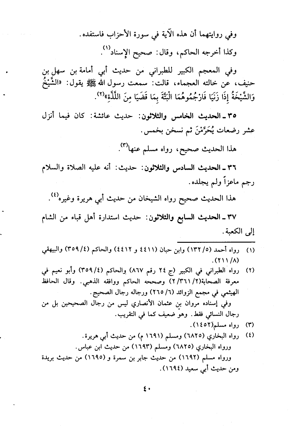وَفِي المعجم الْكَبِير للطبراني من حَدِيث أبي أُمَامَة بن سهل بن حنيف، عَن خَالَته العجماء، قَالَت: سَمِعت رَسُول الله صَلَّى اللَّهُ عَلَيْهِ وَسَلَّم َ يَقُول: «الشَّيْخ وَالشَّيْخَة إِذا زَنَيَا فَارْجُمُوهُمَا الْبَتَّةَ بِمَا قضيا من اللَّذَّة» .