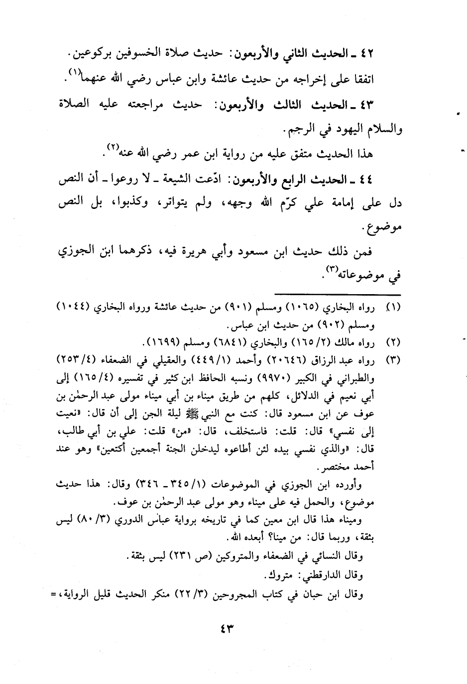 44 - الحَدِيث الرَّابِع وَالْأَرْبَعُونَ: ادَّعَت الشِّيعَة - لَا روعوا - أَن النَّص دلّ عَلَى إِمَامَة عَلّي كرم الله وَجهه، وَلم يتواتر، وكذبوا، بل النَّص مَوْضُوع.