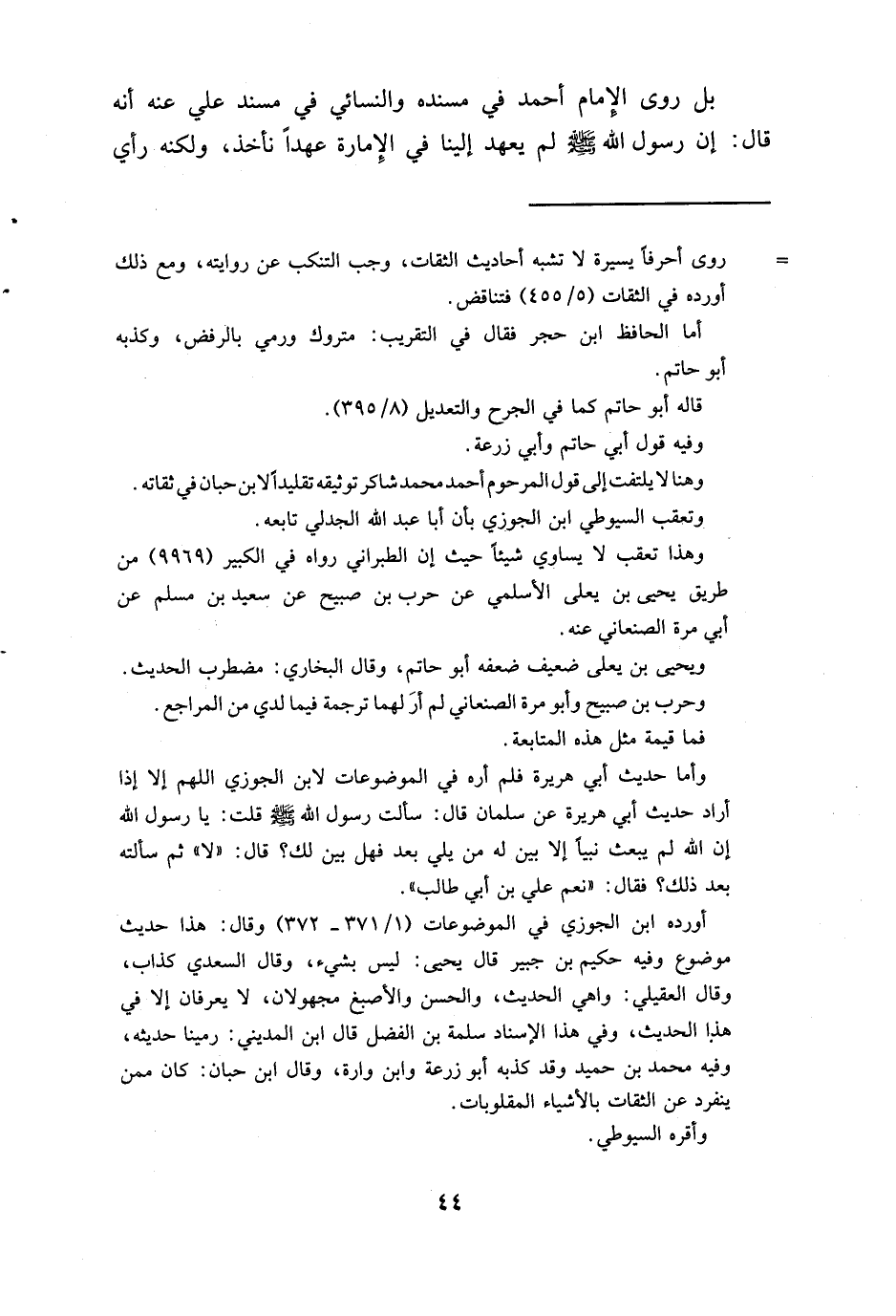 بل رَوَى الإِمَام أَحْمد فِي مُسْنده وَالنَّسَائِيّ فِي مُسْند عَلّي عَنهُ أَنه قَالَ: إِن رَسُول الله صَلَّى اللَّهُ عَلَيْهِ وَسَلَّم َ لم يعْهَد إِلَيْنَا فِي الْإِمَارَة عهدا نَأْخُذ، وَلكنه رَأْي