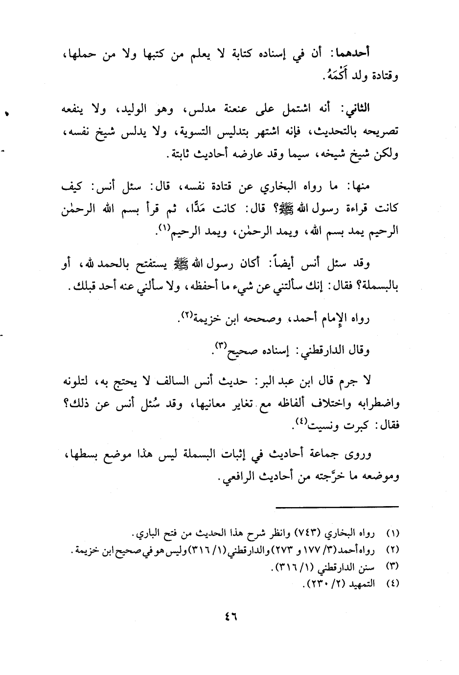 وَرَوَى جمَاعَة أَحَادِيث فِي إِثْبَات الْبَسْمَلَة لَيْسَ هَذَا مَوضِع بسطها، وموضعه مَا خرجته من أَحَادِيث الرَّافِعِيّ.