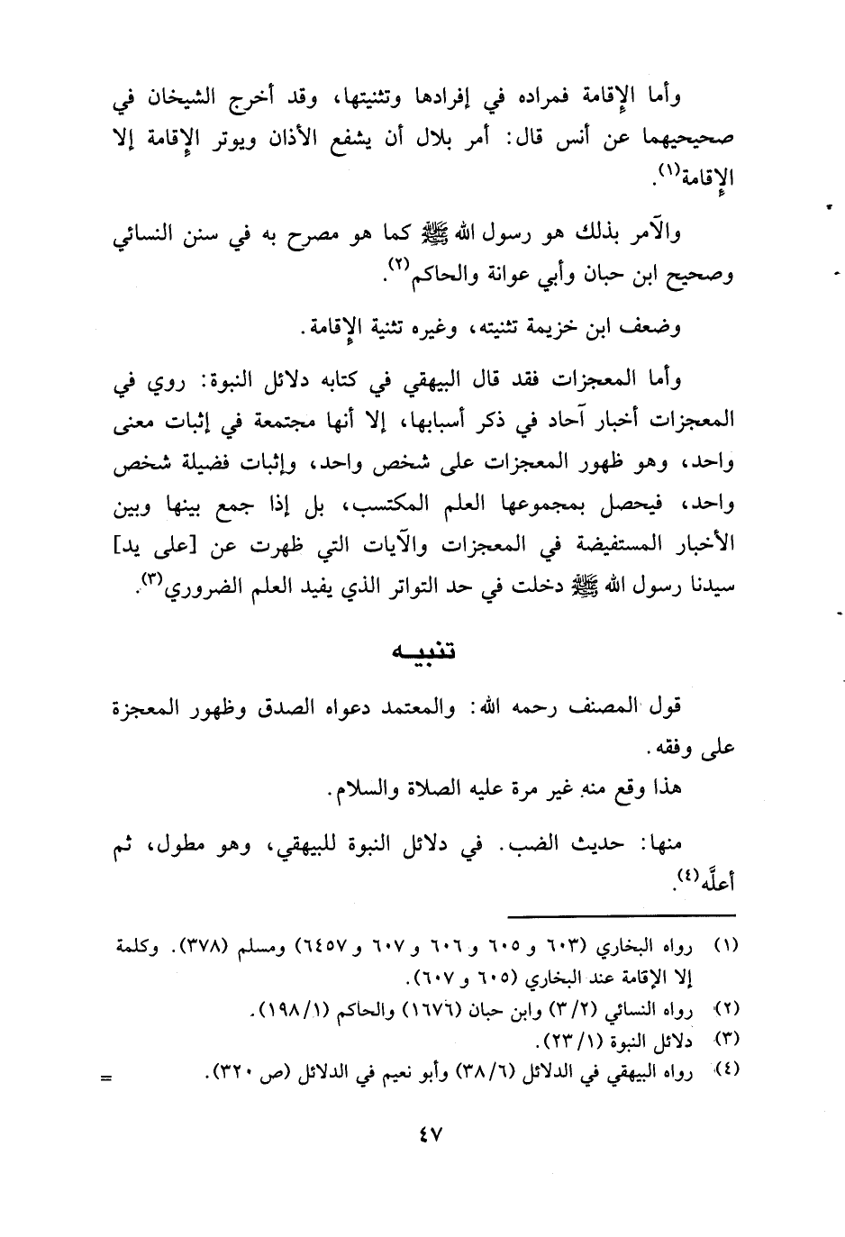 وَأما المعجزات فقد قَالَ الْبَيْهَقِيّ فِي كِتَابه دَلَائِل النُّبُوَّة: رُوِيَ فِي المعجزات أَخْبَار آحَاد فِي ذكر أَسبَابهَا، إِلَّا أَنَّهَا مجتمعة فِي مَعْنَى وَاحِد، وَهُوَ ظُهُور المعجزات عَلَى شخص وَاحِد، وَإِثْبَات فَضِيلَة شخص وَاحِد، وَإِثْبَات فَضِيلَة فَيحصل بمجموعها الْعلم المكتسب، بل إِذا جمع بَينهَا وَبَين الْأَخْبَار المستفيضة فِي المعجزات والآيات الَّتِي ظَهرت عَن [عَلَى يَد] سيدنَا رَسُول الله صَلَّى اللَّهُ عَلَيْهِ وَسَلَّم َ دخلت فِي حد التَّوَاتُر الَّذِي يُفِيد الْعلم الضَّرُورِيّ.