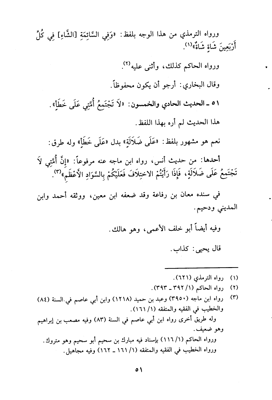 51 - الحَدِيث الْحَادِي وَالْخَمْسُونَ: «لَا تَجْتَمِع أمتِي عَلَى خطأ» .