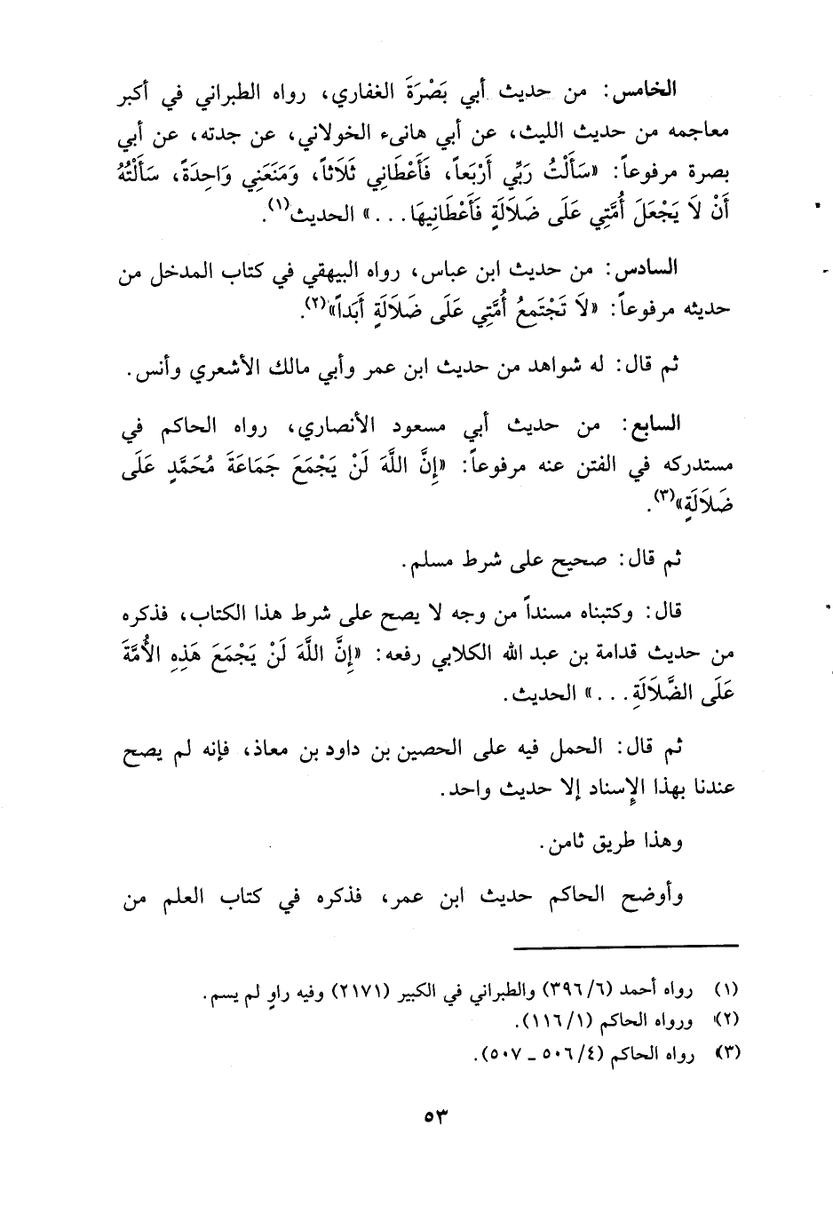 قَالَ: وكتبناه مُسْندًا من وَجه لَا يَصح عَلَى شَرط هَذَا الْكتاب، فَذكره من حَدِيث قدامَة بن عبد الله الْكلابِي رَفعه: «إِن الله لن يجمع هَذِه الْأمة عَلَى الضَّلَالَة ... » الحَدِيث.
