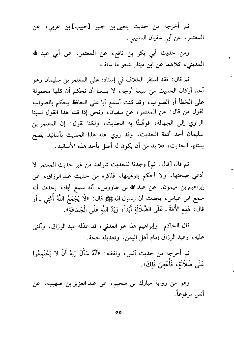 قَالَ الْحَاكِم: وَإِبْرَاهِيم هَذَا هُوَ الْعَدنِي، قد عدله عبد الرَّزَّاق، وَأَثْنَى عَلَيْهِ، وَعبد الرَّزَّاق إِمَام أهل الْيمن، وتعديله حجَّة. ثمَّ أخرجه من حَدِيث أنس، وَلَفظه: «أَنه سَأَلَ ربه أَن لَا يجتمعوا عَلَى ضَلَالَة، فَأعْطِي ذَلِك» .