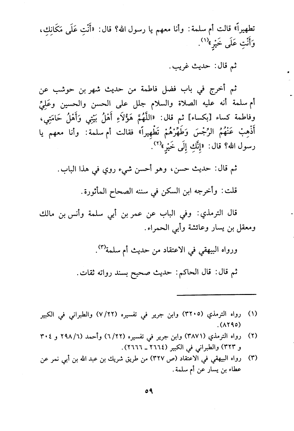 ثمَّ أخرج فِي بَاب فضل فَاطِمَة من حَدِيث شهر بن حَوْشَب عَن أم سَلمَة أَنه علية الصَّلَاة وَالسَّلَام جلل عَلَى الْحسن وَالْحُسَيْن وَعلي وَفَاطِمَة كسَاء [بكساء] ثمَّ قَالَ: «اللَّهُمَّ هَؤُلَاءِ أهل بَيْتِي وَأهل حامتي، أذهب عَنْهُم الرجس وطهرهم تَطْهِيرا» فَقَالَت أم سَلمَة: وَأَنا مَعَهم يَا رَسُول الله؟ قَالَ: «إِنَّك إِلَى خير» .