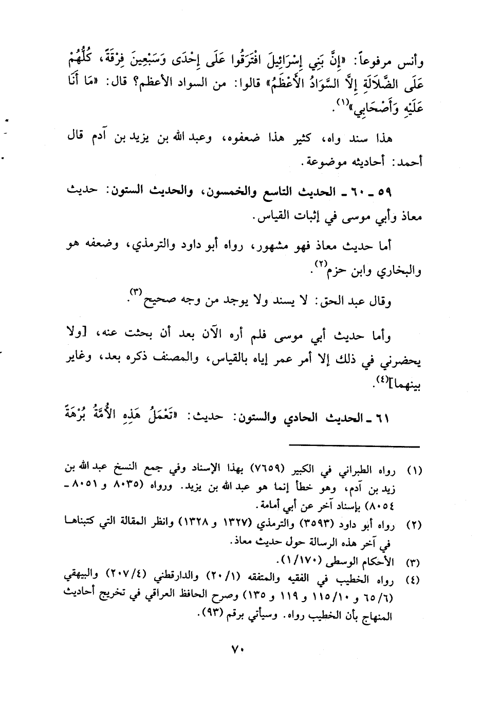أما حَدِيث معَاذ فَهُوَ مَشْهُور، رَوَاهُ أَبُو دَاوُد وَالتِّرْمِذِيّ، وَضَعفه هُوَ وَالْبُخَارِيّ وَابْن حزم.