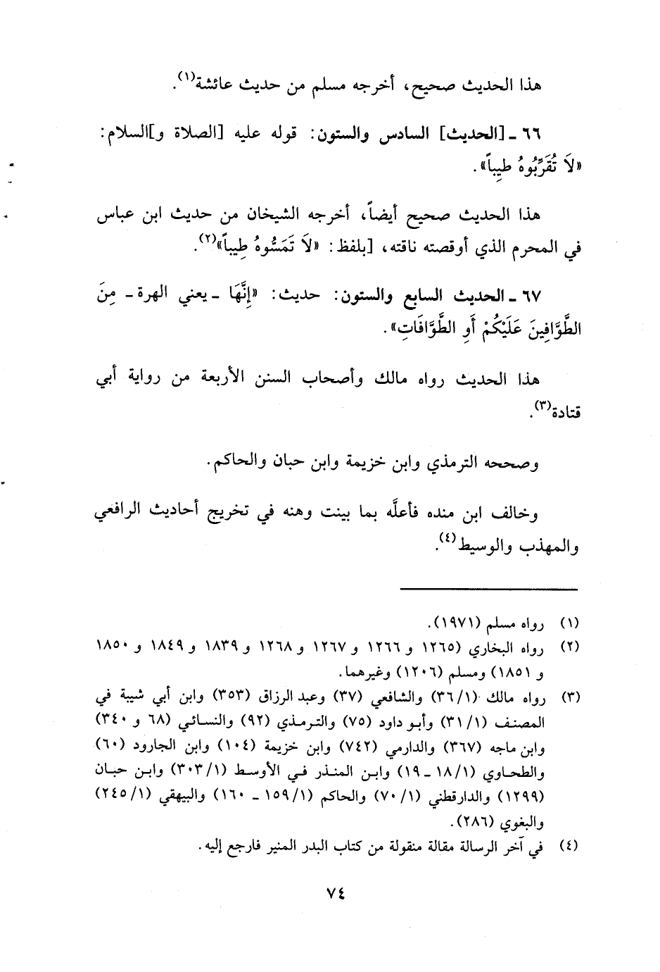 67 - الحَدِيث السَّابِع وَالسِّتُّونَ: حَدِيث: «إِنَّهَا - يَعْنِي الْهِرَّة - من الطوافين عَلَيْكُم أَو الطوافات» .