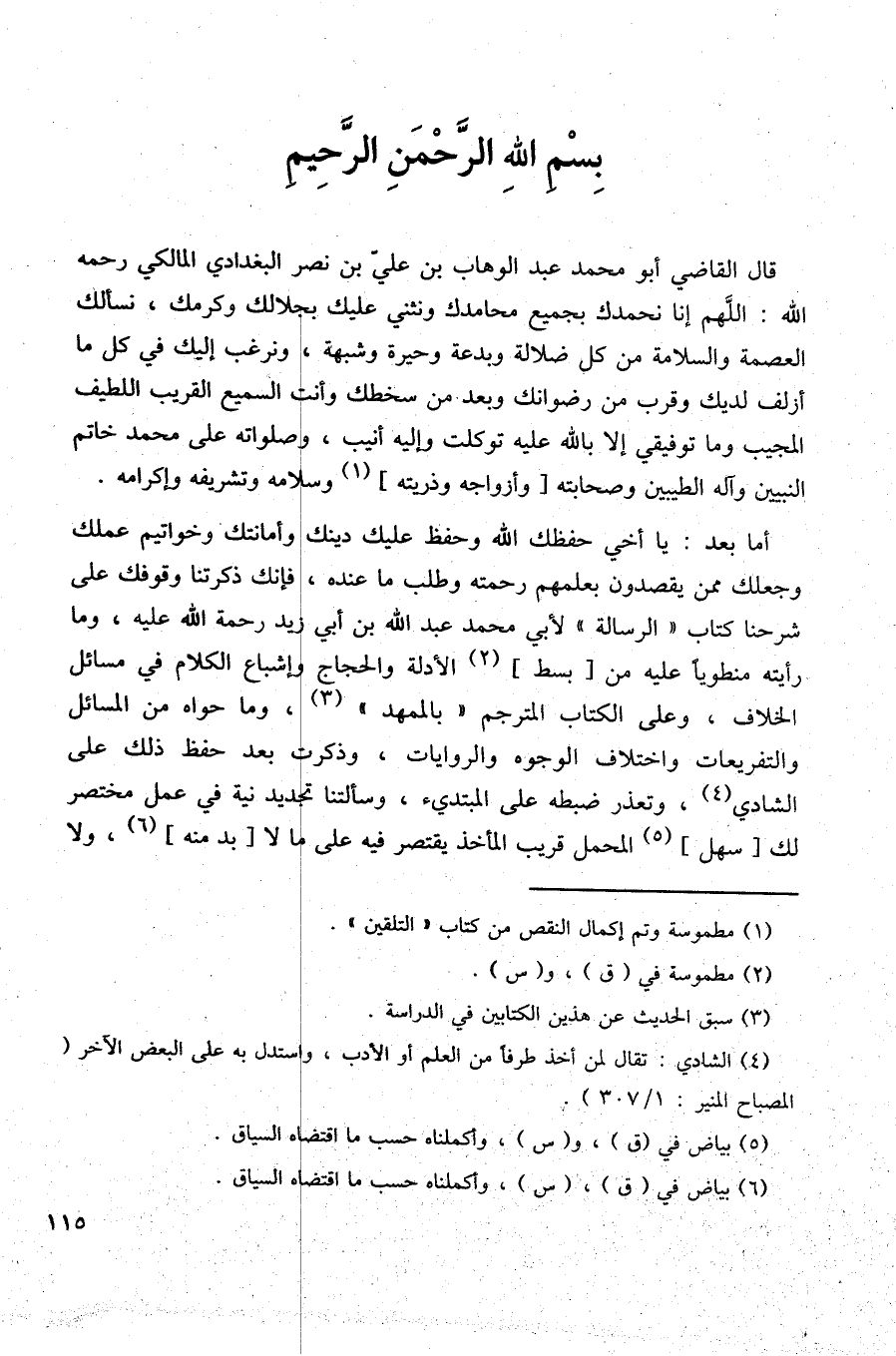 قال القاضي أبو محمَّد عبد الوهاب بن علي بن نصر البغدادي المالكي رحمه الله: اللَّهم إنا نحمدك بجميع محامدك ونثني عليك بجلالك وكرمك، نسألك العصمة والسلامة من كل ضلالة وبدعة وحيرة وشبهة، ونرغب إليك في كل ما أزلف لديك وقرب من رضوانك وبعد من سخطك وأنت السميع القريب اللطيف المجيب وما توفيقي إلا بالله عليه توكلت وإليه أنيب، وصلواته على محمَّد خاتم النبيين وآله الطيبين وصحابته [وأزواجه وذريته] (¬1) وسلامه وتشريفه وإكرامه.