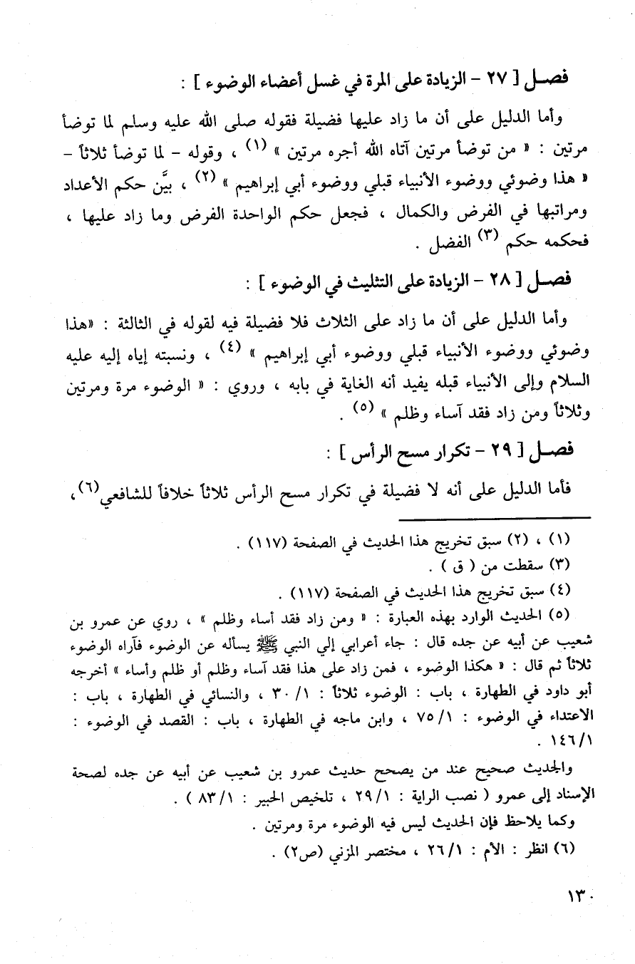(¬5) الحديث الوارد بهذه العبارة: "ومن زاد فقد أساء وظلم"، روي عن عمرو بن شعيب عن أبيه عن جده قال: جاء أعرابي إلى النبي - صلى الله عليه وسلم - يسأله عن الوضوء فآراه الوضوء ثلاثًا ثم قال: "هكذا الوضوء، فمن زاد على هذا فقد أساء وظلم أو ظلم وأساء" أخرجه أبو داود في الطهارة، باب: الوضوء ثلاثًا: 1/ 30، والنسائي في الطهارة، باب: الاعتداء في الوضوء:1/ 75، وابن ماجه في الطهارة، باب: القصد في الوضوء: 1/ 146.