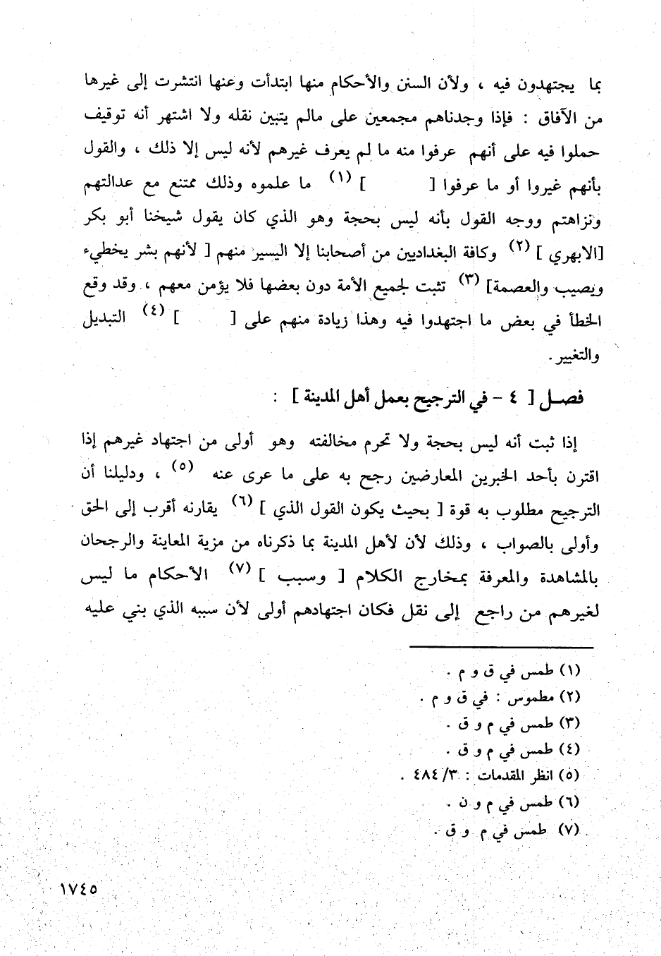بما يجتهدون فيه , ولأن السنن والأحكام منا ابتدأت وعنها انتشرت إلى غيرها من الآفاق: فإذا وجدناهم مجمعين على ما لم يتبين نقله ولا اشتهر أنه توقيف حملوا فيه على أنهم عرفوا منه ما لم يعرف غيرهم لأنه ليس إلا ذلك , والقول بأنهم غيروا أو ما عرفوا [] (¬1) ما علموه وذلك ممتنع مع عدالتهم ونزاهتهم ووجه القول بأنه ليس بحجة وهو الذي كان يقول شيخنا أبو بكر [الأبهري] (¬2) وكافة البغداديين من أصحابنا إلا اليسير منهم [لأنهم بشر يخطيء ويصيب والعصمة] (¬3) تثبت لجميع الأمة دون بعضها فلا يؤمن معهم , وقد وقع الخطأ في بعض ما اجتهدوا فيه وهذا زيادة منهم على [] (¬4) التبديل والتغيير.