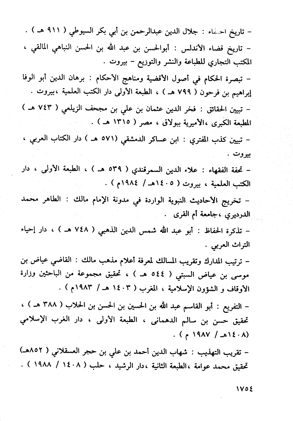 - تبصرة الحكام في أصول الأقضية ومناهج الأحكام: برهان الدين أبو الوفا إبراهيم بن فرحون (799 هـ)، الطبعة الأولى دار الكتب العلمية، بيروت.