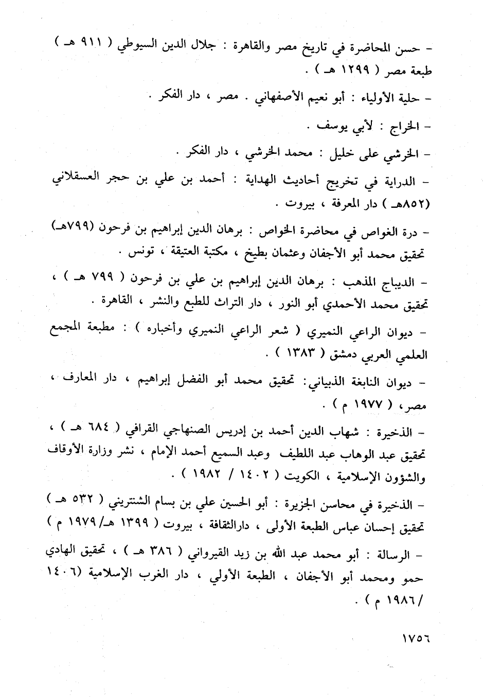 - الذخيرة: شهاب الدين أحمد بن إدريس الصنهاجي القرافي (684 هـ)، تحقيق عبد الوهاب عبد اللطيف وعبد السميع أحمد الإمام، نشر وزارة الأوقاف والشؤون الإِسلامية، الكويت (1402/ 1982).