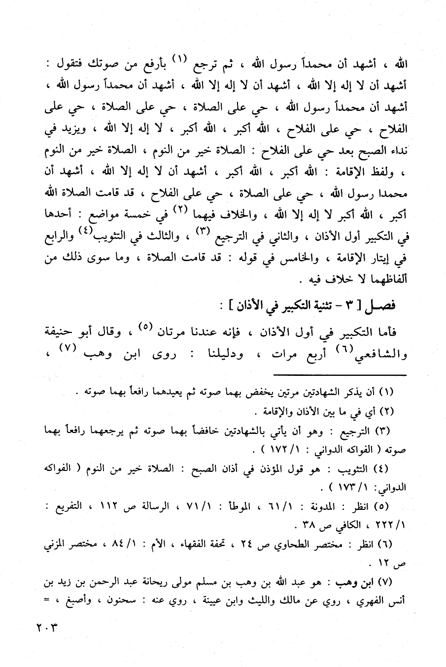 (¬3) الترجيع: وهو أن يأتي بالشهادتين خافضًا بهما صوته ثم يرجعهما رافعًا بهما صوته (الفواكه الدواني: 1/ 172).