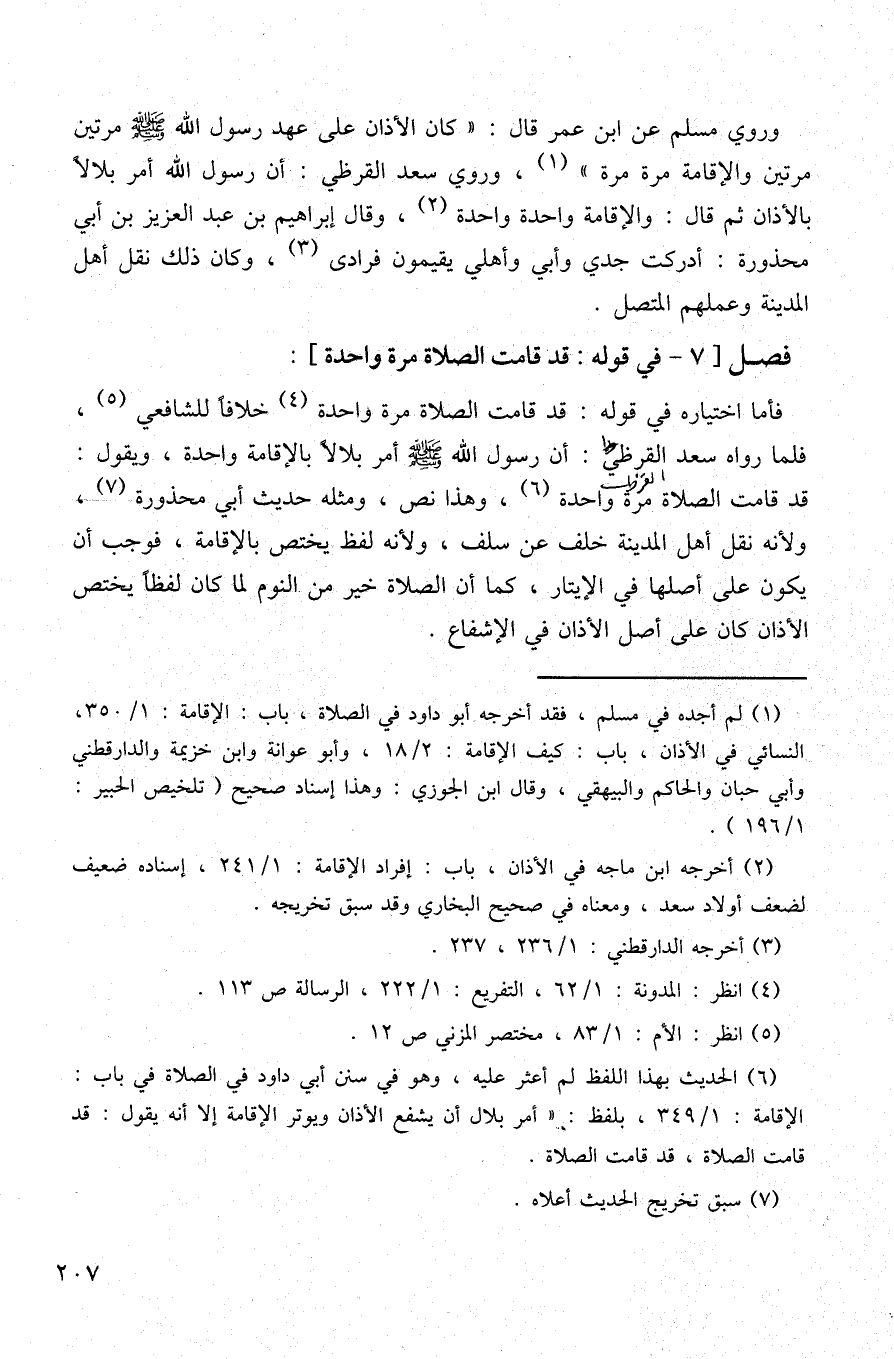 وروي مسلم عن ابن عمر قال: "كان الأذان على عهد رسول الله - صلى الله عليه وسلم - مرتين مرتين والإقامة مرة مرة" (¬1)، وروي سعد القرظي: أن رسول الله أمر بلالًا بالأذان ثم قال: والإقامة واحدة واحدة (¬2)، وقال إبراهيم بن عبد العزيز بن أبي محذورة: أدركت جدي وأبي وأهلي يقيمون فرادى (¬3)، وكان ذلك نقل أهل المدينة وعملهم المتصل.