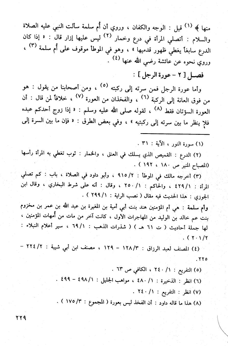 (¬3) أخرجه مالك في الموطأ: 2/ 915، وأبو داود في الصلاة، باب: كم تصلي المرأة: 1/ 429، والحاكم: 1/ 250، وقال: أنه على شرط البخاري، وقال ابن الجوزي: هذا الحديث فيه مقال (نصب الراية: 1/ 299).