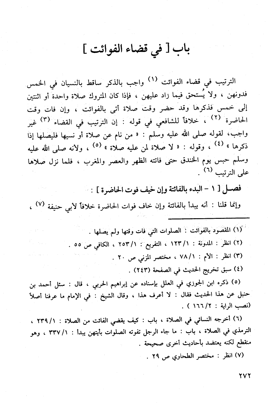 (¬6) أخرج النسائي في الصلاة، باب: كيف يقضي الفائت من الصلاة: 1/ 239، الترمذي في الصلاة، باب: ما جاء الرجل تفوته الصلوات بأيتهن يبدأ: 1/ 337، وهو منقطع لكنه يعتضد بأحاديث أخرى صحيحة.