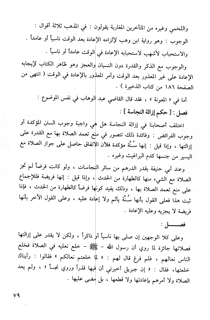 والوجوب مع الذكر والقدرة دون النسيان والعجز وهو ظاهر الكتاب لإيجابه الإعادة على غير المعذور بعد الوقت وأمر المعذور بالإعادة في الوقت (انتهى من الصفحة 186 من كتاب الذخيرة).