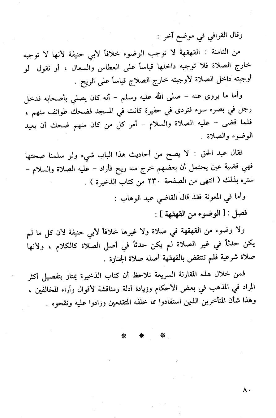 من الثامثة: القهقهة لا توجب الوضوء خلافًا لأبي حنيفة لأنها لا توجبه خارج الصلاة فلا توجبه داخلها قياسًا على العطاس والسعال، أو نقول لو أوجبته داخل الصلاة لأوجبته خارج الصلاح قياسًا على الريح.