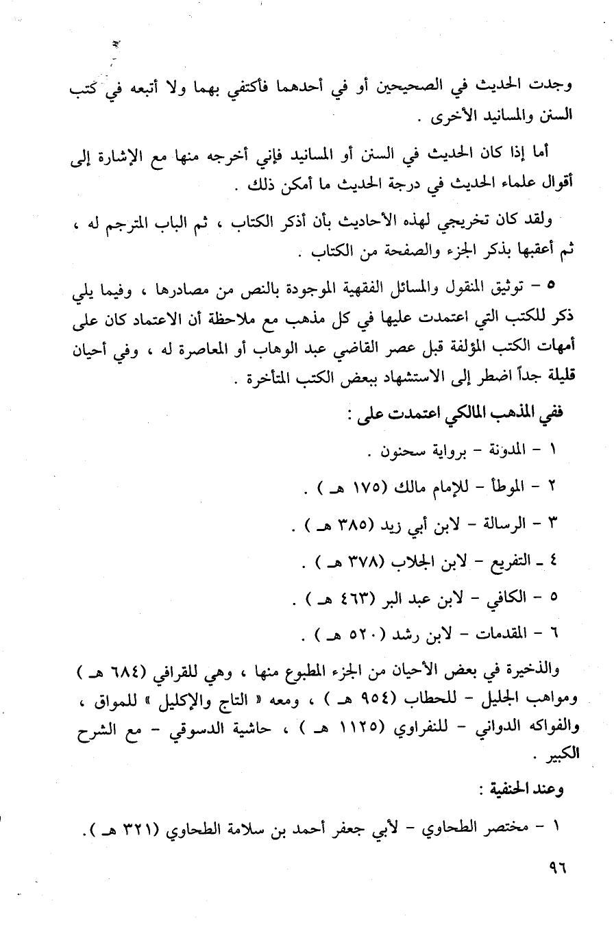 والذخيرة في بعض الأحيان من الجزء المطبوع منها، وهي للقرافي (684 هـ) ومواهب الجليل- للحطاب (954 هـ)، ومعه "التاج والإكليل" للمواق، والفواكه الدواني- للنفراوي (1125 هـ)، حاشية الدسوقي- مع الشرح الكبير.