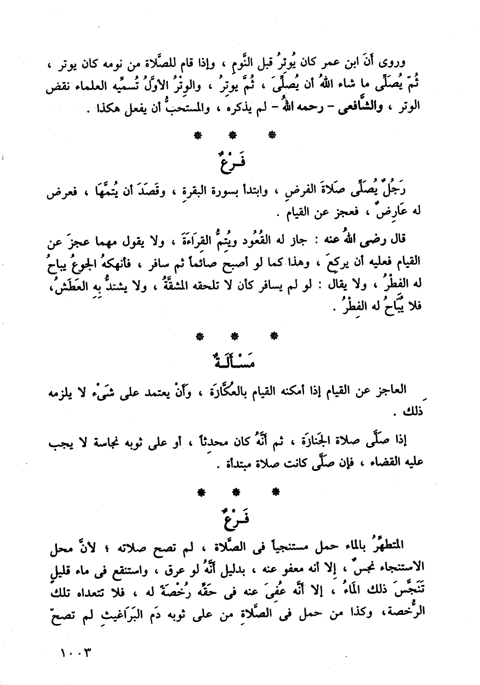 قال رضي الله عنه: جاز له القعود ويتم القراءة، ولا يقول مهما عجز عن القيام فعليه أن يركع، وهذا كما لو أصبح صائمًا ثم سافر، فأنهكه الجوع يباح له الفطر ولا يقال لو لم يسافر كأن لا تلحقه المشقة، ولا يشتد به العطش. فلا يباح له الفطر.