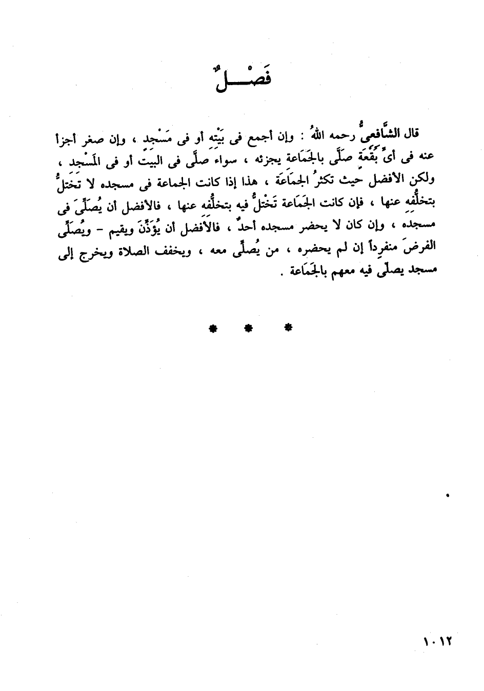 قال الشافعي: رحمه الله: وإن أجمع في بيته أو في مسجد، وإن صغر أجزأ عنه في أي بقعة صلى بالجماعة يجزئه، سواء في البيت أو في المسجد، ولكن الأفضل حيث تكثر الجماعة، هذا إذا كانت الجماعة في مسجده لا تختل بتخلفه عنها، فإن الجماعة تختل فيه بتخلفه عنها، فالأفضل أن يصلي في مسجده وإن كان لا يحضر مسجده أحد، فالأفضل أن يؤذن ويقيم، ويصلي الفرض منفردًا، إن لم يحضره، من يصلي معه، ويخفف الصلاة ويخرج إلى مسجد يصلي فيه معهم بالجماعة.
